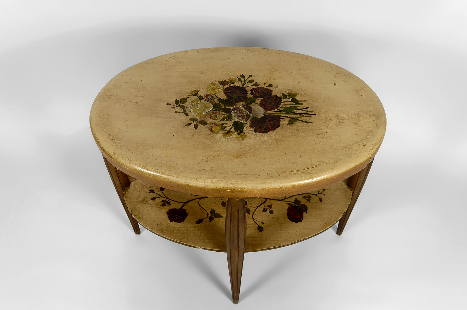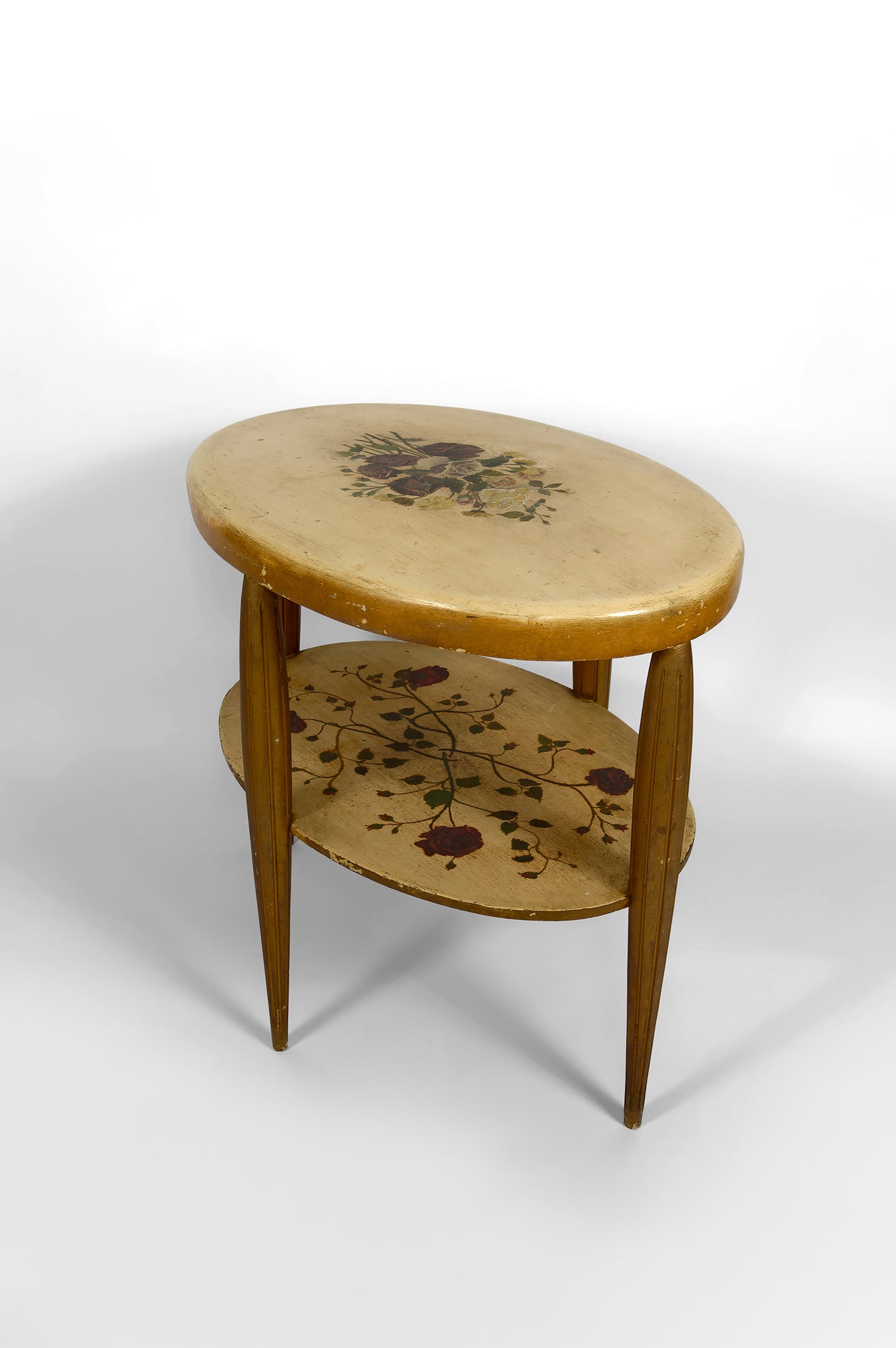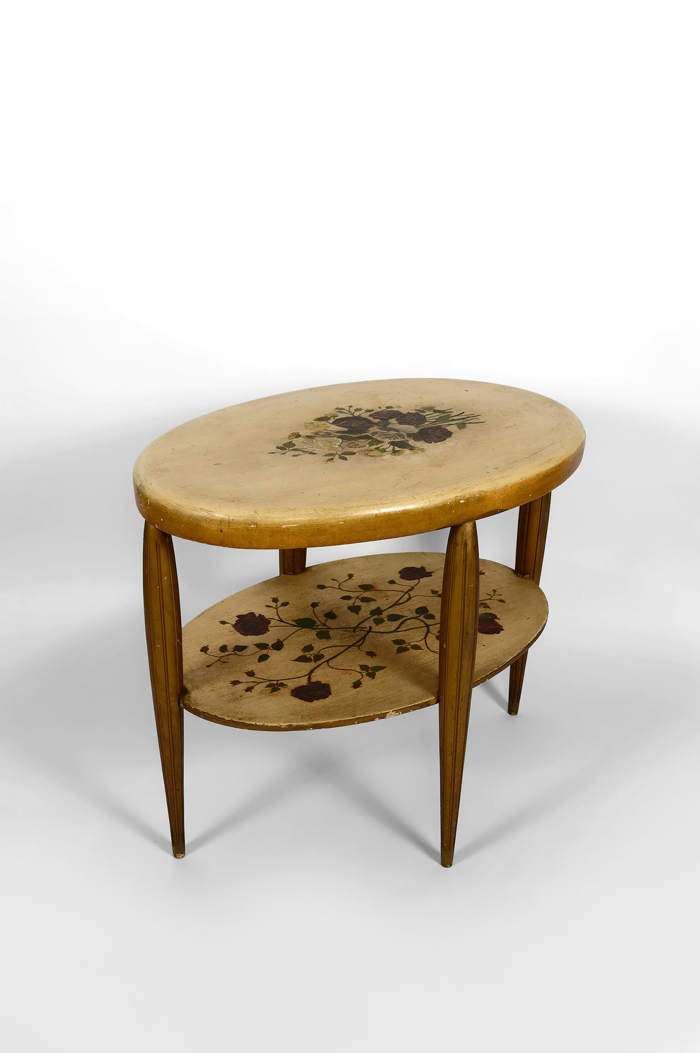 Ce guéridon ancien, à la présence visuelle immédiatement captivante, se distingue par son double plateau circulaire délicatement peint à la main, orné d’un décor floral luxuriant composé de roses stylisées, feuillages fins et entrelacs végétaux, sublimés par une dorure patinée aux nuances chaudes. Chaque détail évoque le travail minutieux des ateliers décoratifs français de haut niveau, où l’objet utilitaire devenait une véritable œuvre d’art.