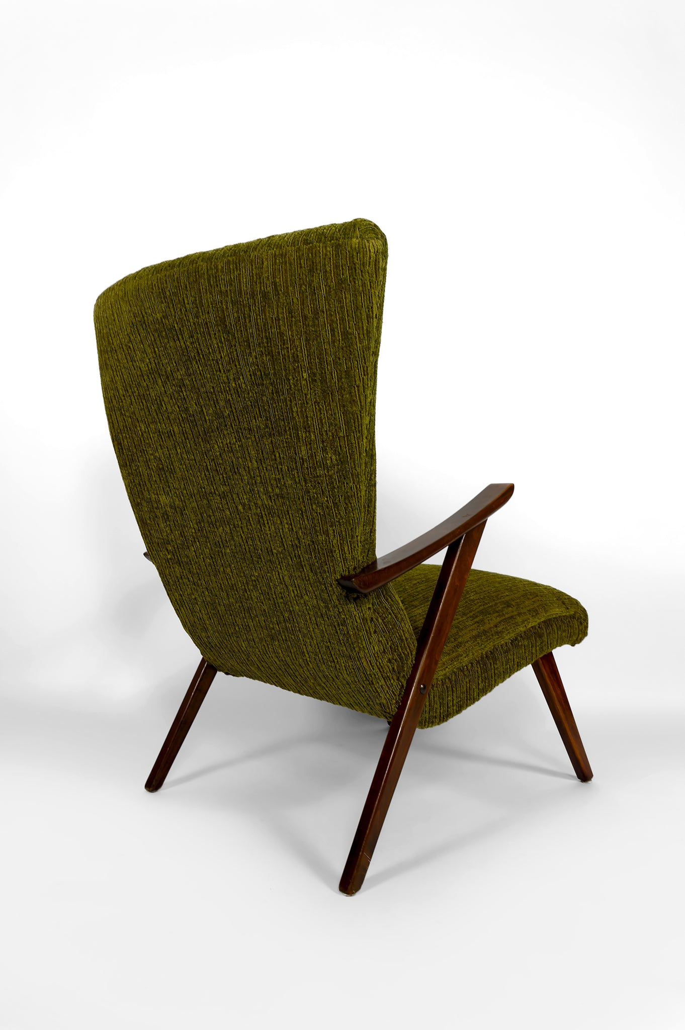 Le fauteuil est habillé de son tissu vert d’origine, à la texture profonde et chaleureuse, dans un état de conservation remarquable. Cette teinte, aujourd’hui extrêmement recherchée, apporte caractère, sophistication et une touche organique idéale aussi bien dans un intérieur contemporain que dans une ambiance plus classique ou minimaliste.
