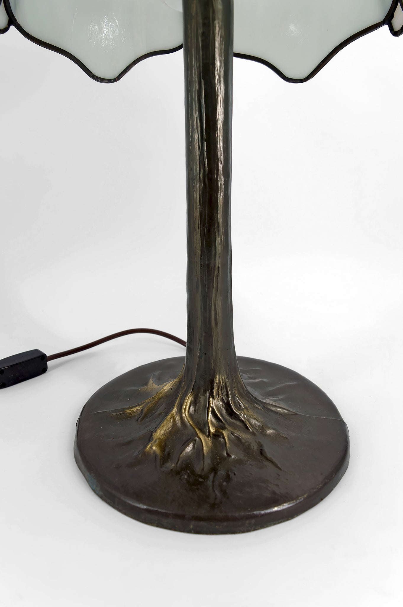 Elle repose sur un pied en métal finement patiné bronze, au dessin organique évoquant un tronc d’arbre aux racines apparentes, offrant une présence sculpturale et chaleureuse. La patine, subtilement nuancée, souligne les reliefs et confère à l’ensemble une belle profondeur visuelle.