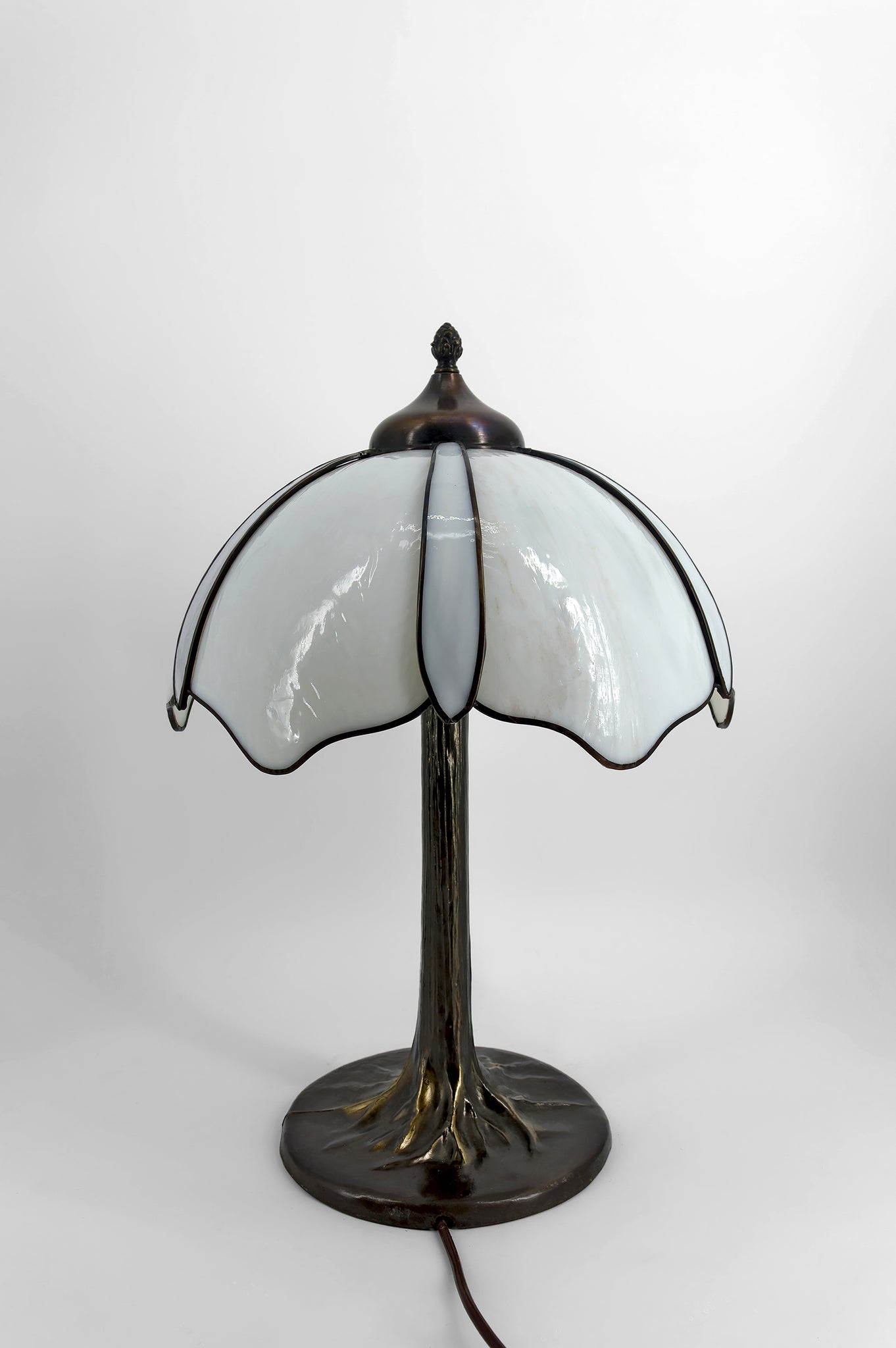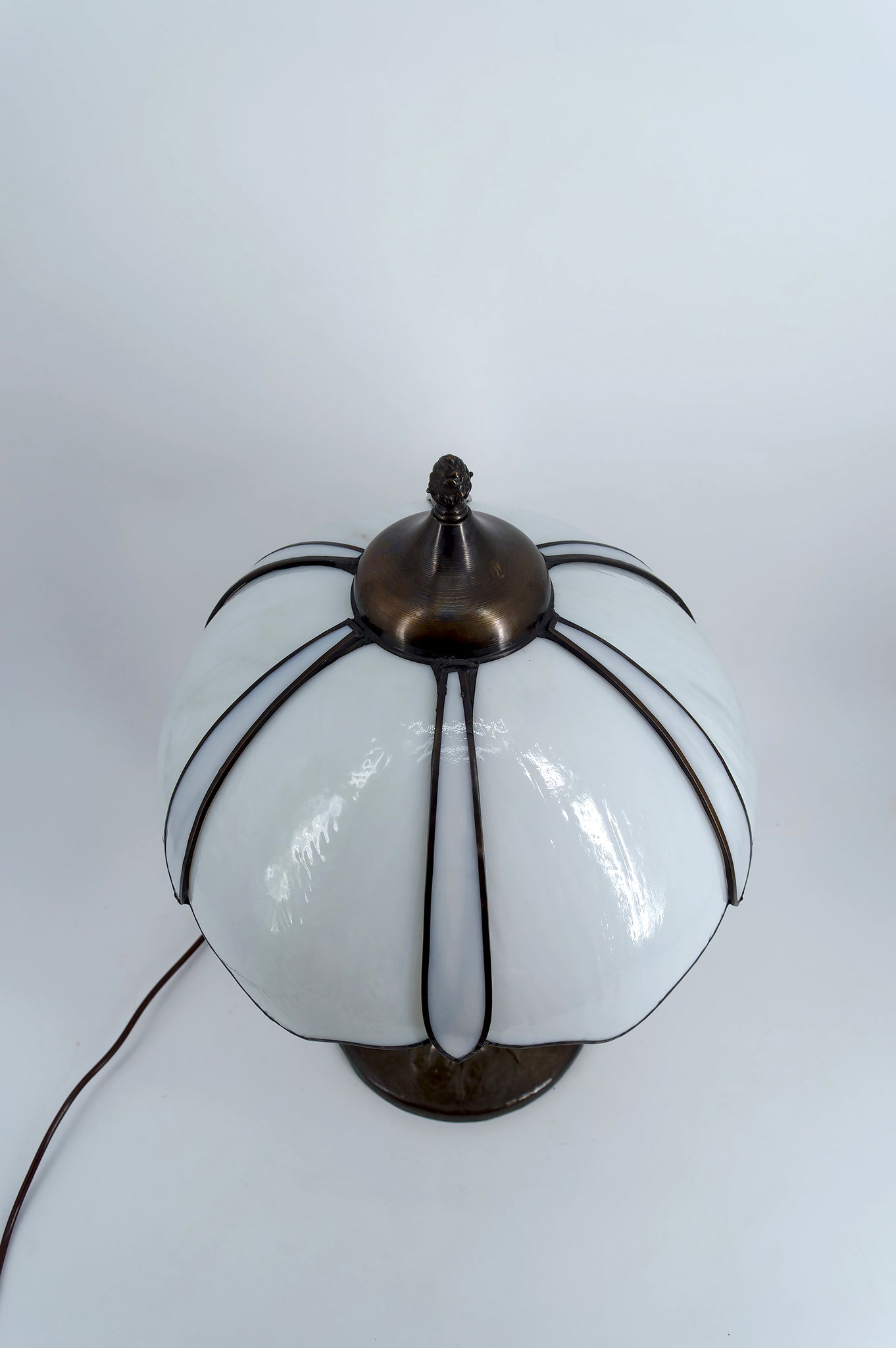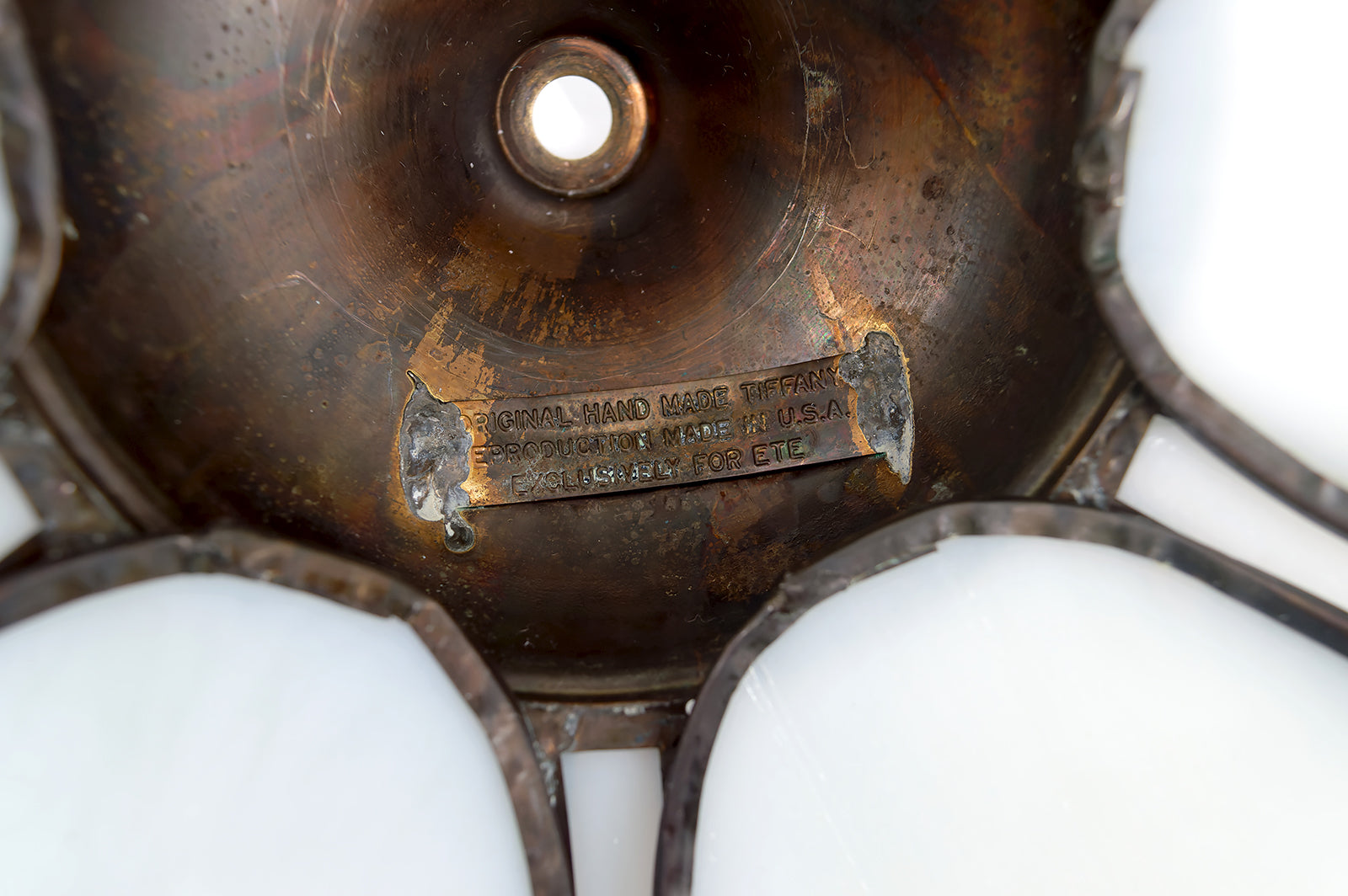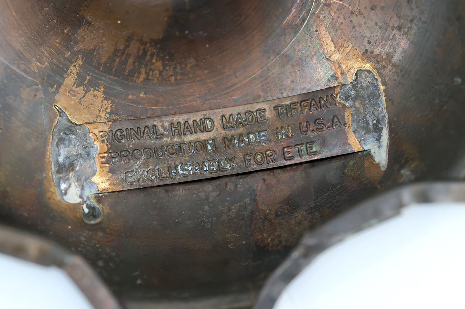 L’abat-jour en verre opalin, aux lignes délicatement galbées et cerclées de montures sombres, diffuse une lumière douce et enveloppante, typique de l’esthétique Tiffany. Une plaque d’origine apposée à l’intérieur de l’abat-jour indique : “Original Hand Made Tiffany Reproduction Made in USA Exclusively for ETE”, attestant de sa provenance et de son authenticité.