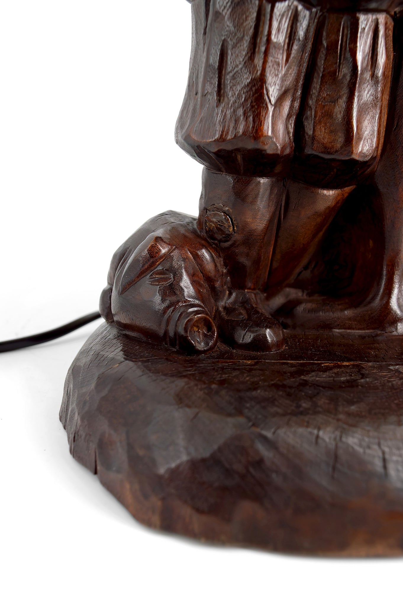 Le pied, entièrement sculpté dans le bois, présente une scène narrative d’une grande expressivité :