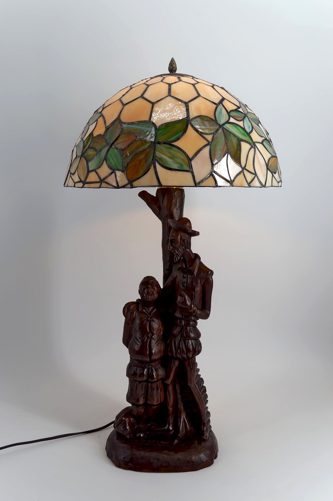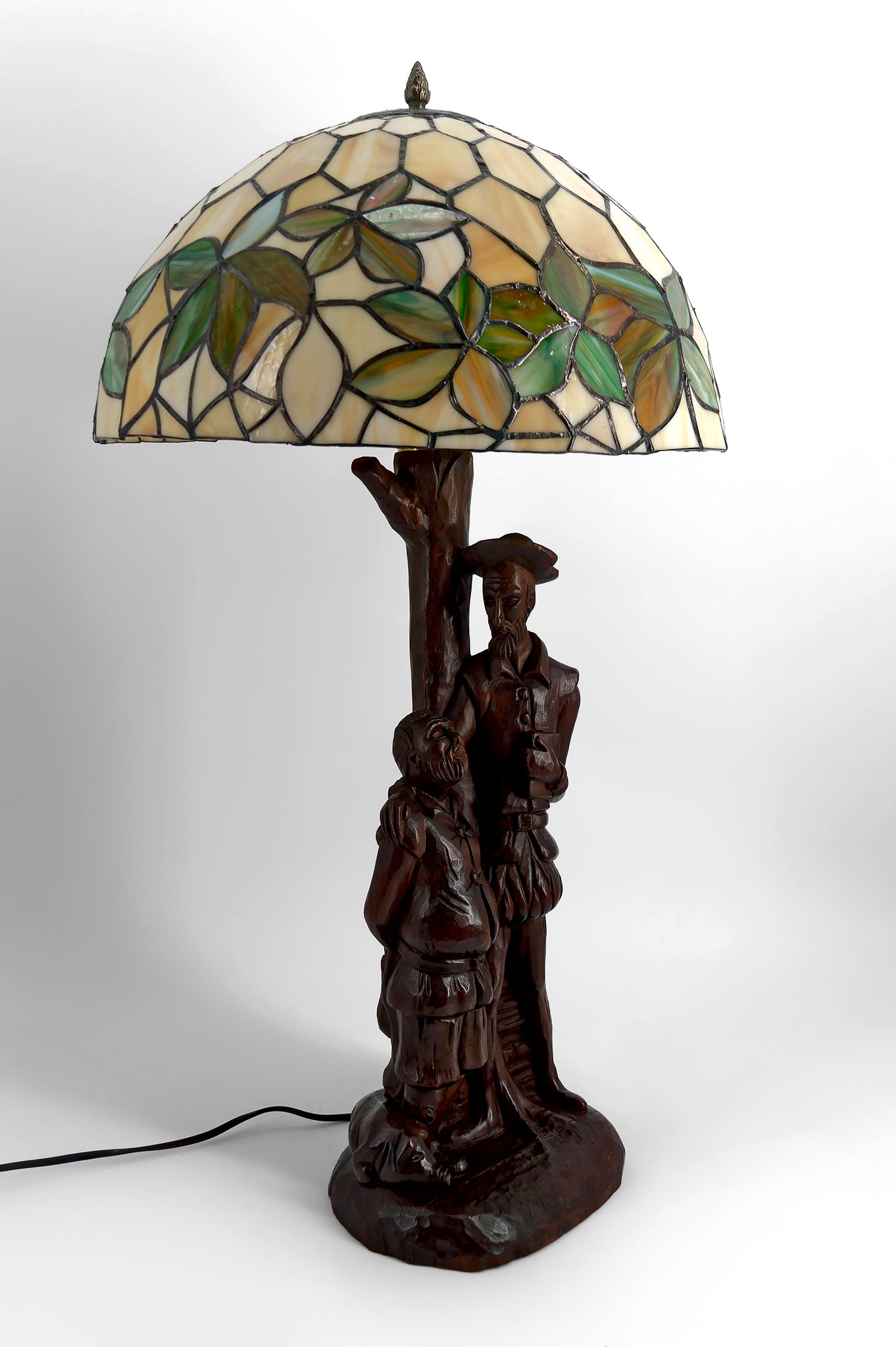 Rare et remarquable lampe figurative issue de la tradition de la Forêt-Noire allemande, représentant Don Quichotte et son fidèle serviteur Sancho Panza, inspirés du chef-d’œuvre de Cervantès.