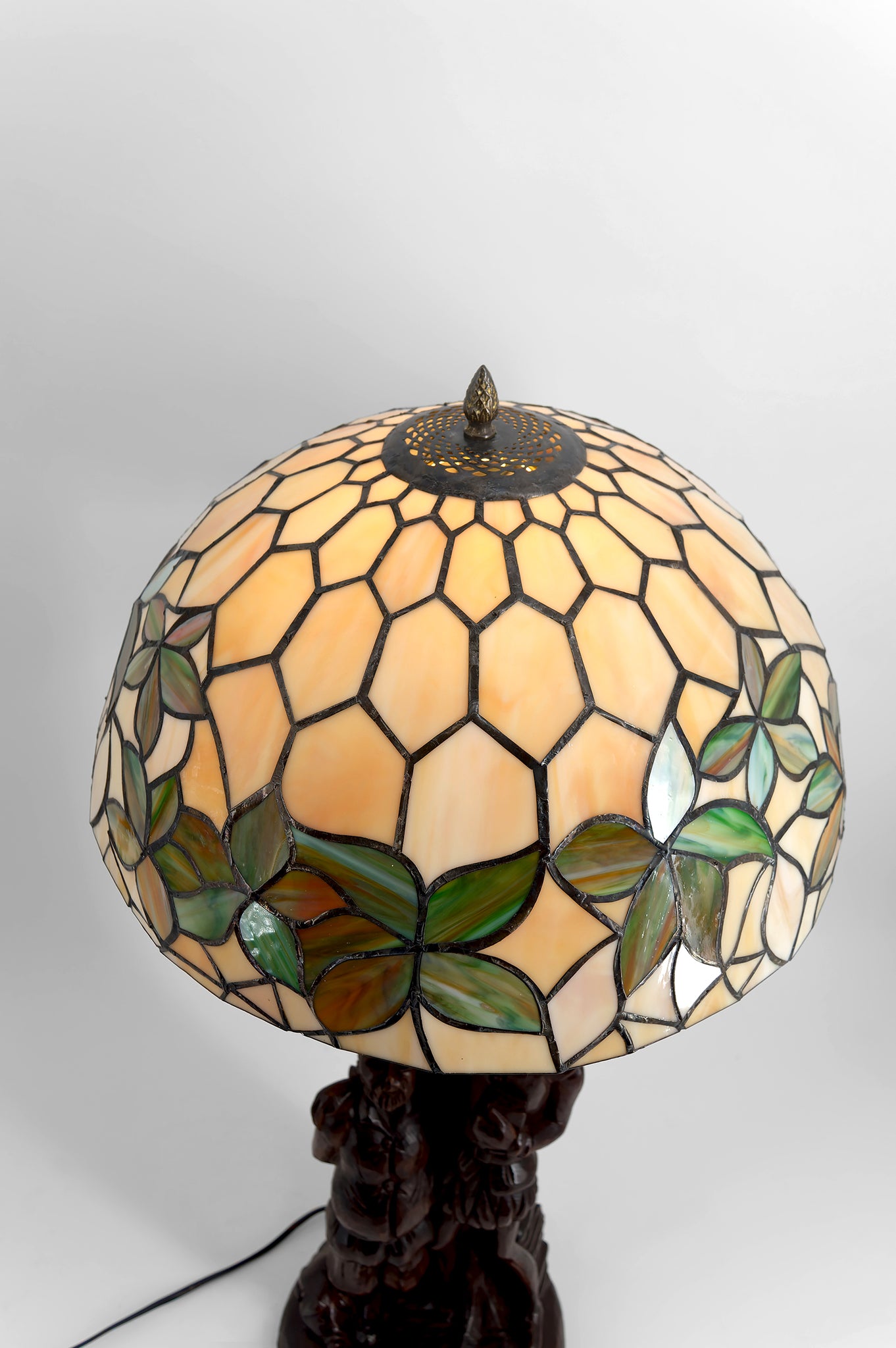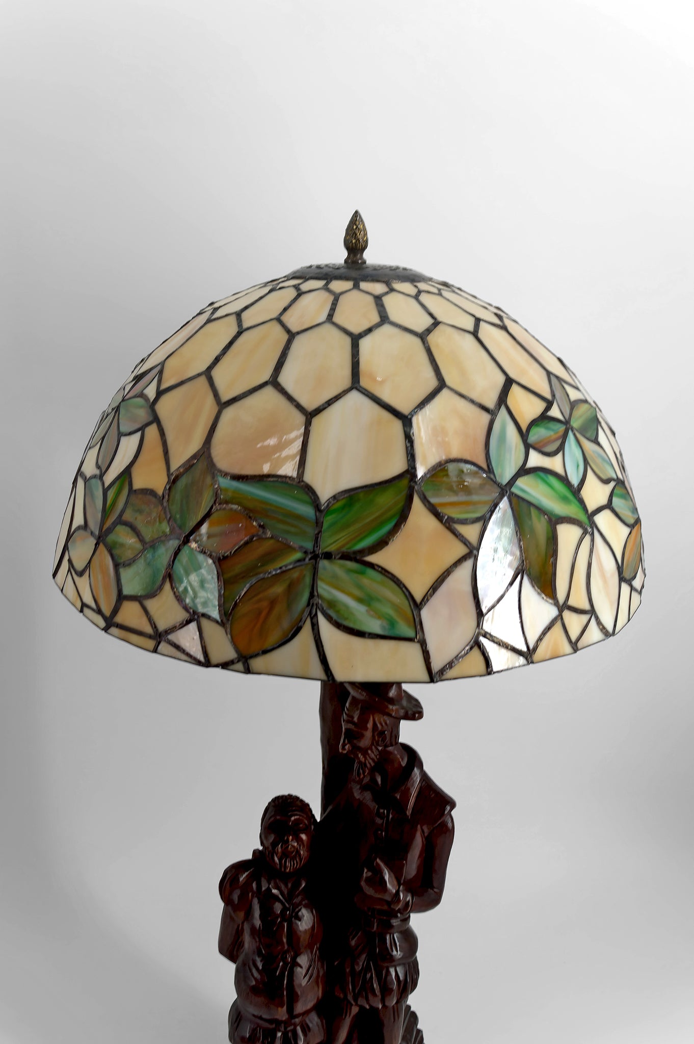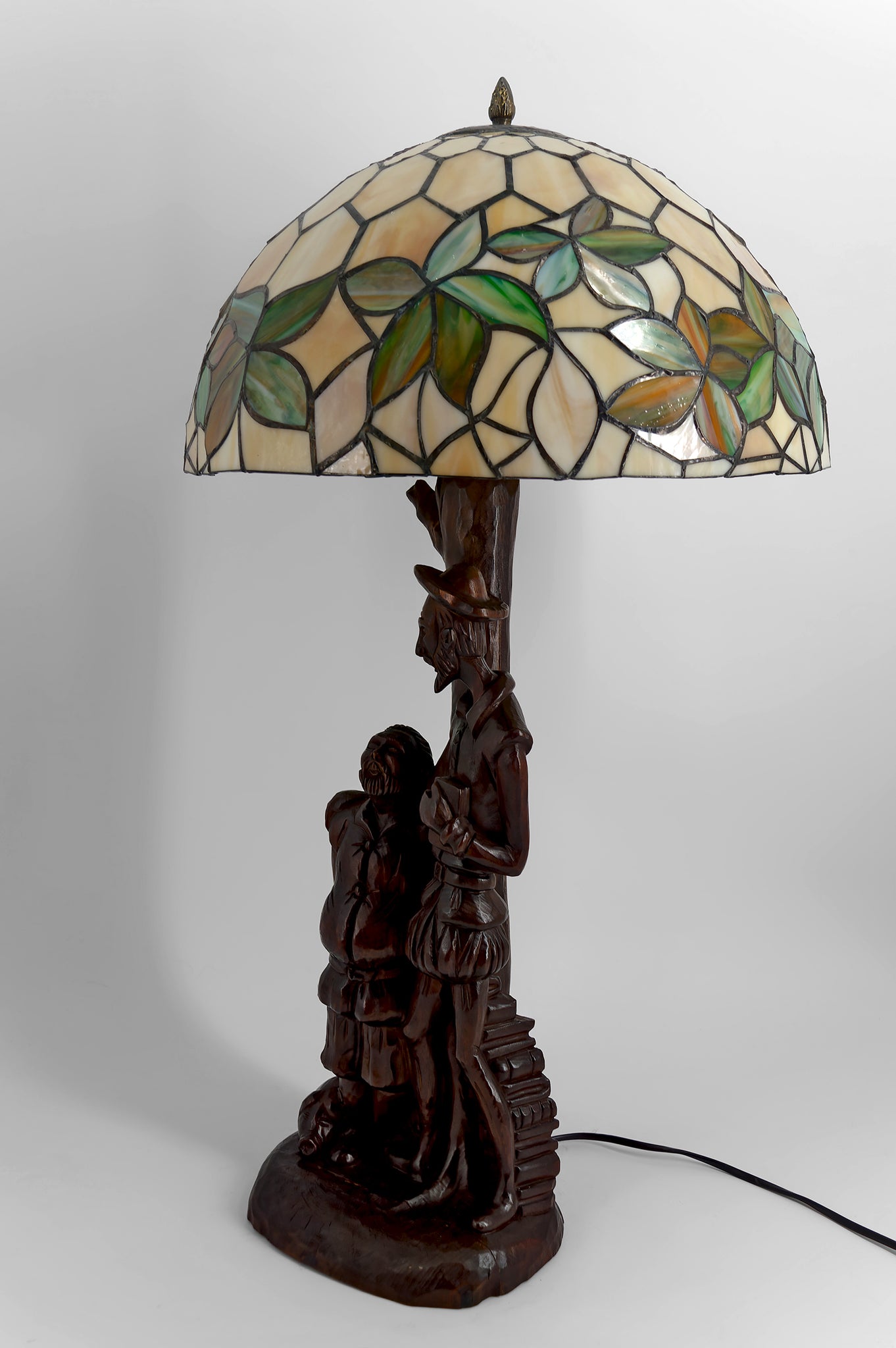L’ensemble est surmonté d’un abat-jour en vitrail de type Tiffany, aux tonalités crème et vertes, figurant un feuillage stylisé. Ce décor végétal dialogue harmonieusement avec le thème de l’arbre et diffuse une lumière chaude et enveloppante, mettant en valeur les reliefs profonds de la sculpture.