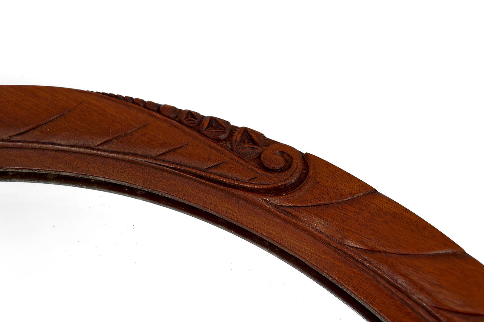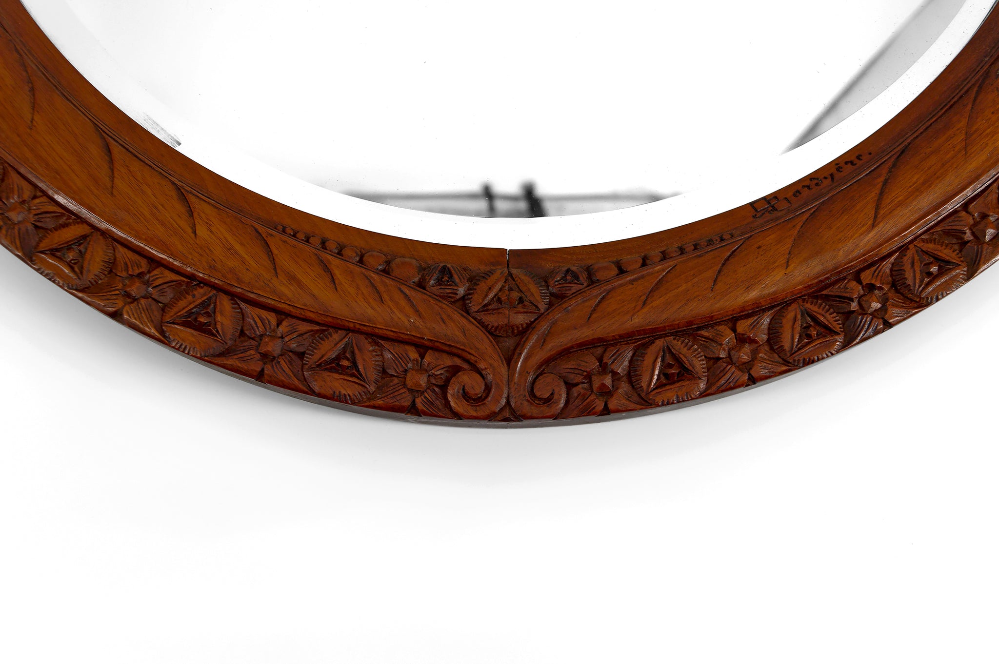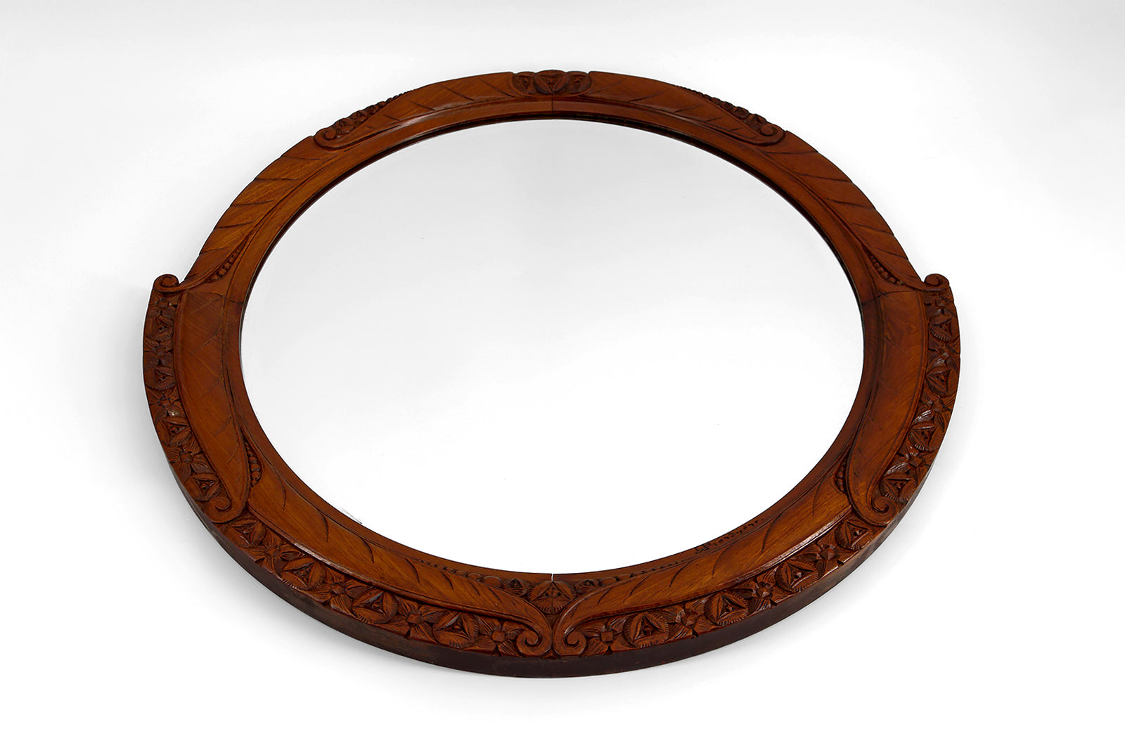 De forme ovale, ce miroir est doté d’un cadre en acajou sculpté, remarquable par la qualité et la finesse de son décor. La sculpture, intégralement travaillée dans la masse, développe un élégant répertoire de motifs végétaux stylisés, rythmés par des volutes et des lignes courbes, parfaitement représentatifs du vocabulaire décoratif Art déco français de la période.