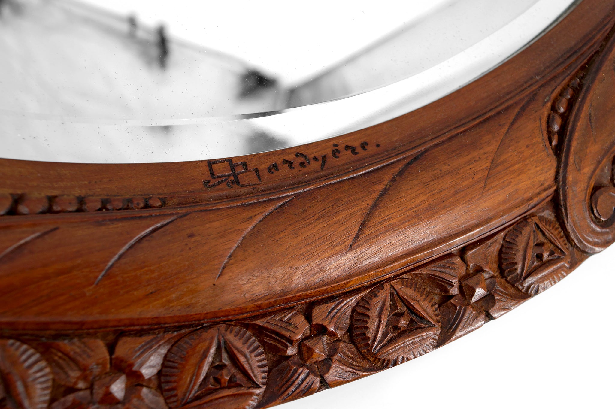 Le miroir biseauté, d’origine, apporte profondeur et luminosité à l’ensemble, tandis que la patine chaude de l’acajou souligne avec subtilité les reliefs de la sculpture. Le cadre porte la signature de De Bardyère, gravée discrètement, garantissant l’authenticité et l’intérêt historique de la pièce.