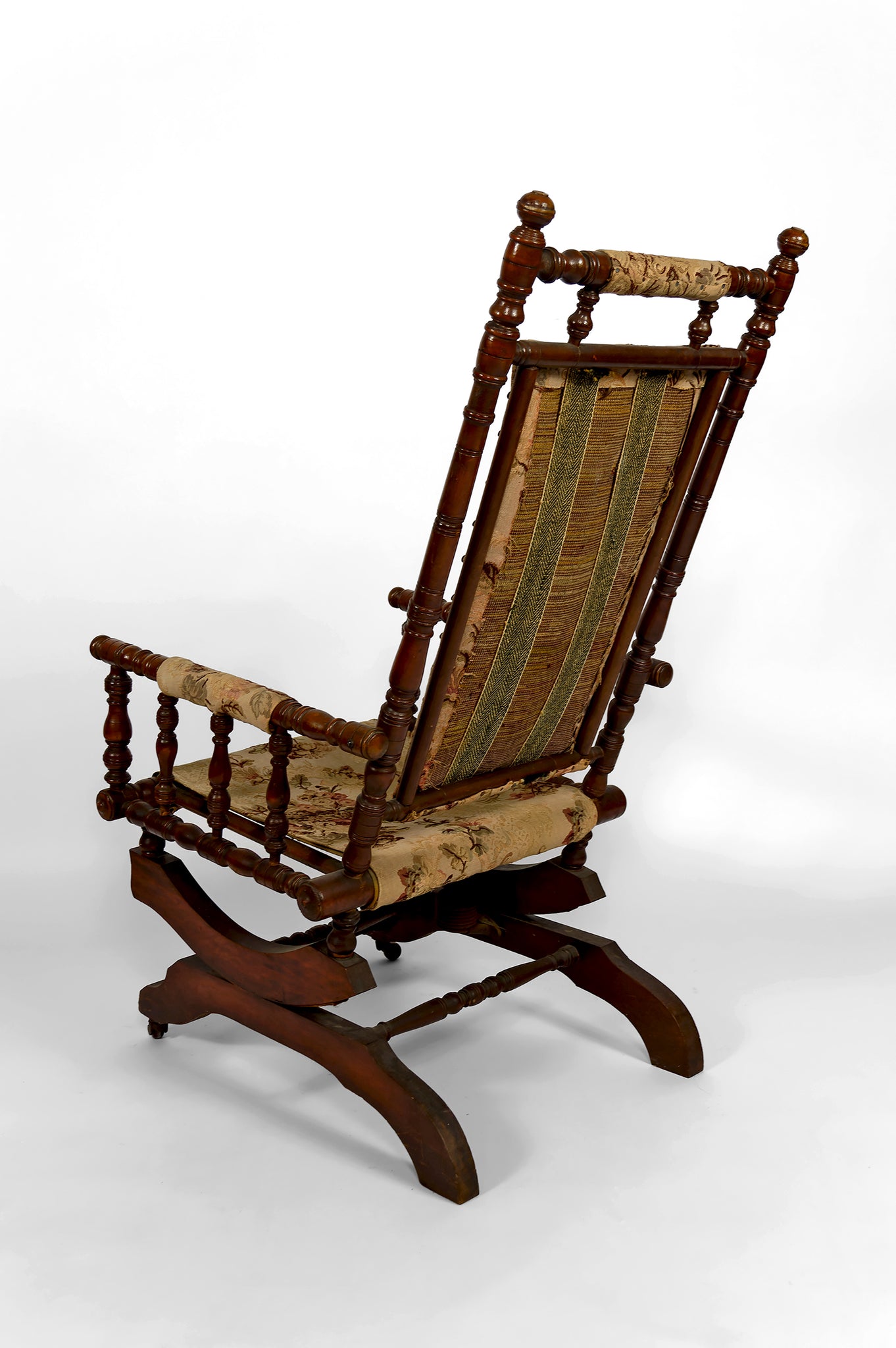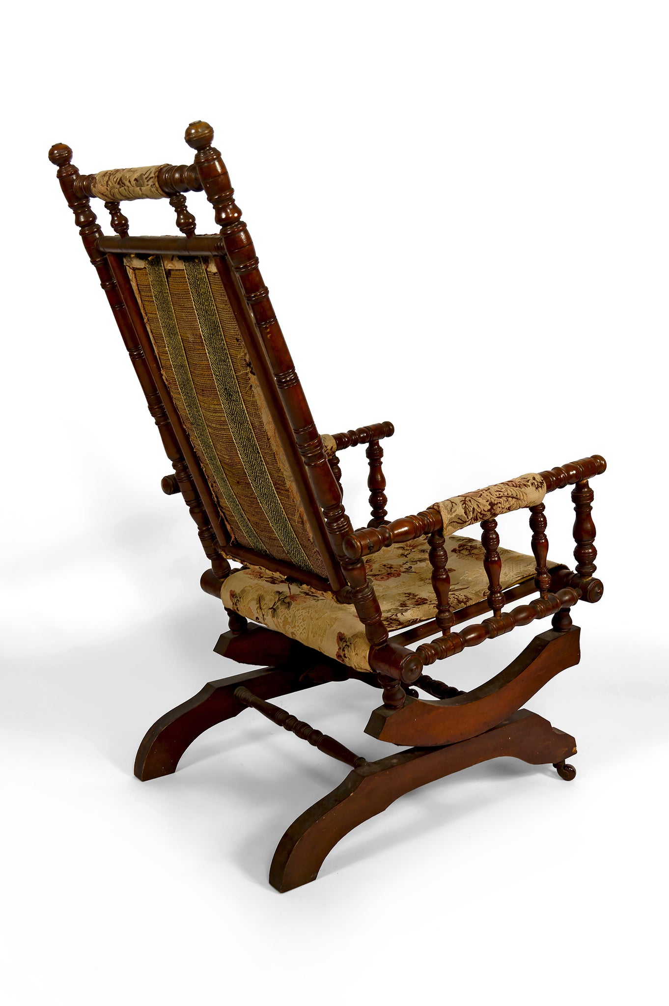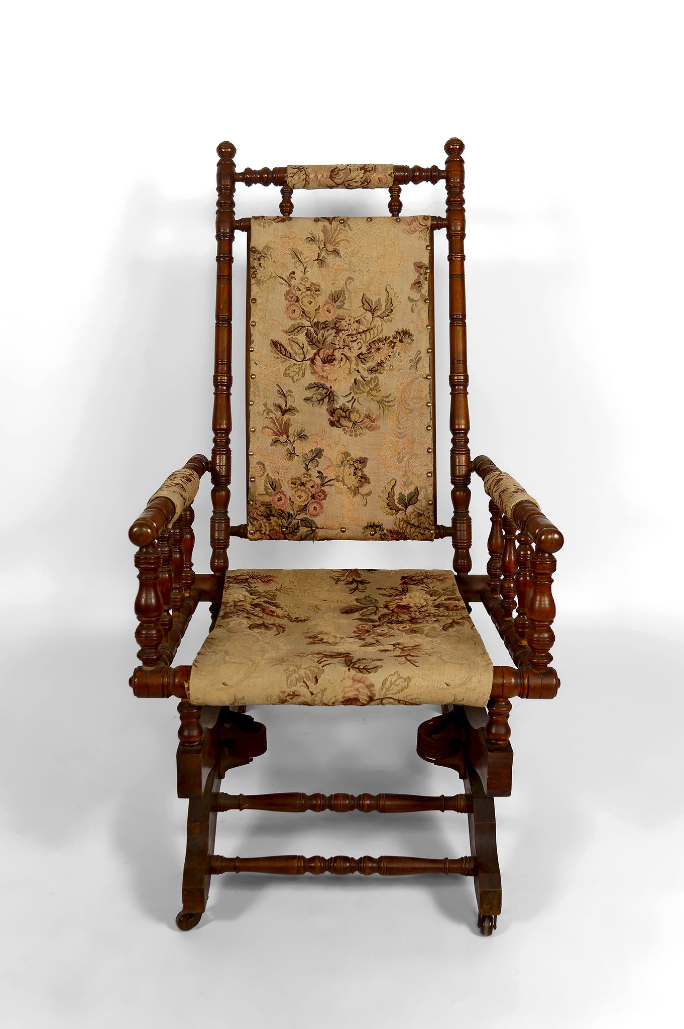 Réalisé en bois massif finement tourné, ce fauteuil à bascule présente une structure à la fois équilibrée et architecturée : montants élancés, accotoirs à balustres tournés de manière régulière, traverses harmonieusement rythmées et élégants patins de bascule galbés, rehaussés de petites roulettes d’origine à l’avant — un détail à la fois pratique et caractéristique des intérieurs bourgeois de l’époque victorienne.