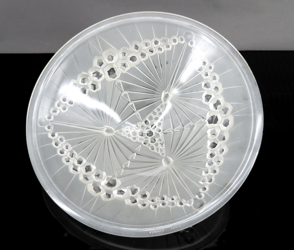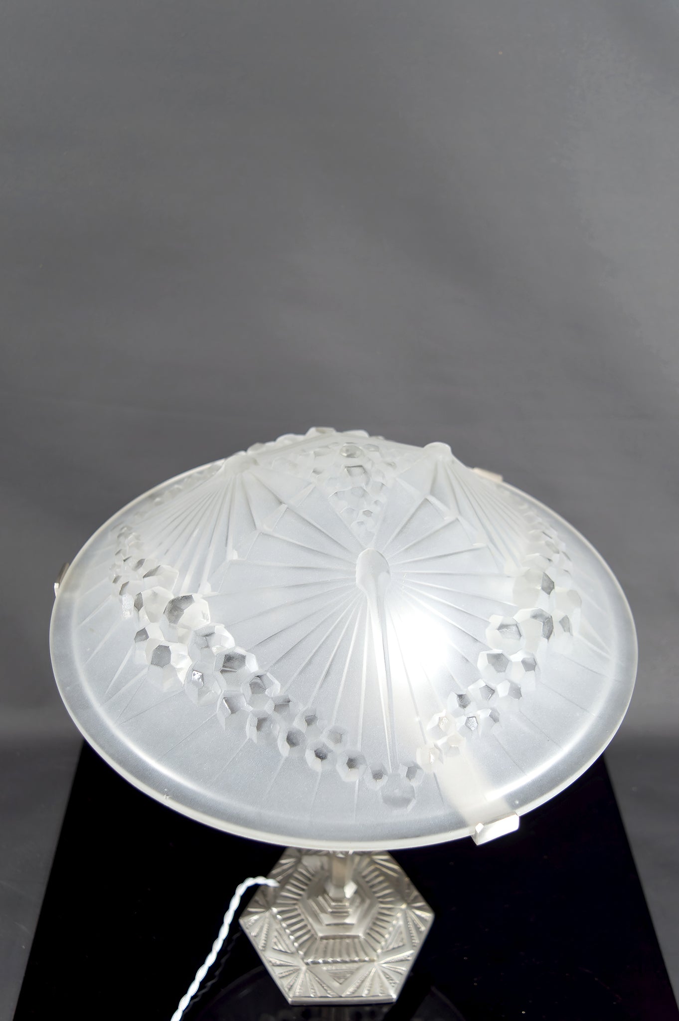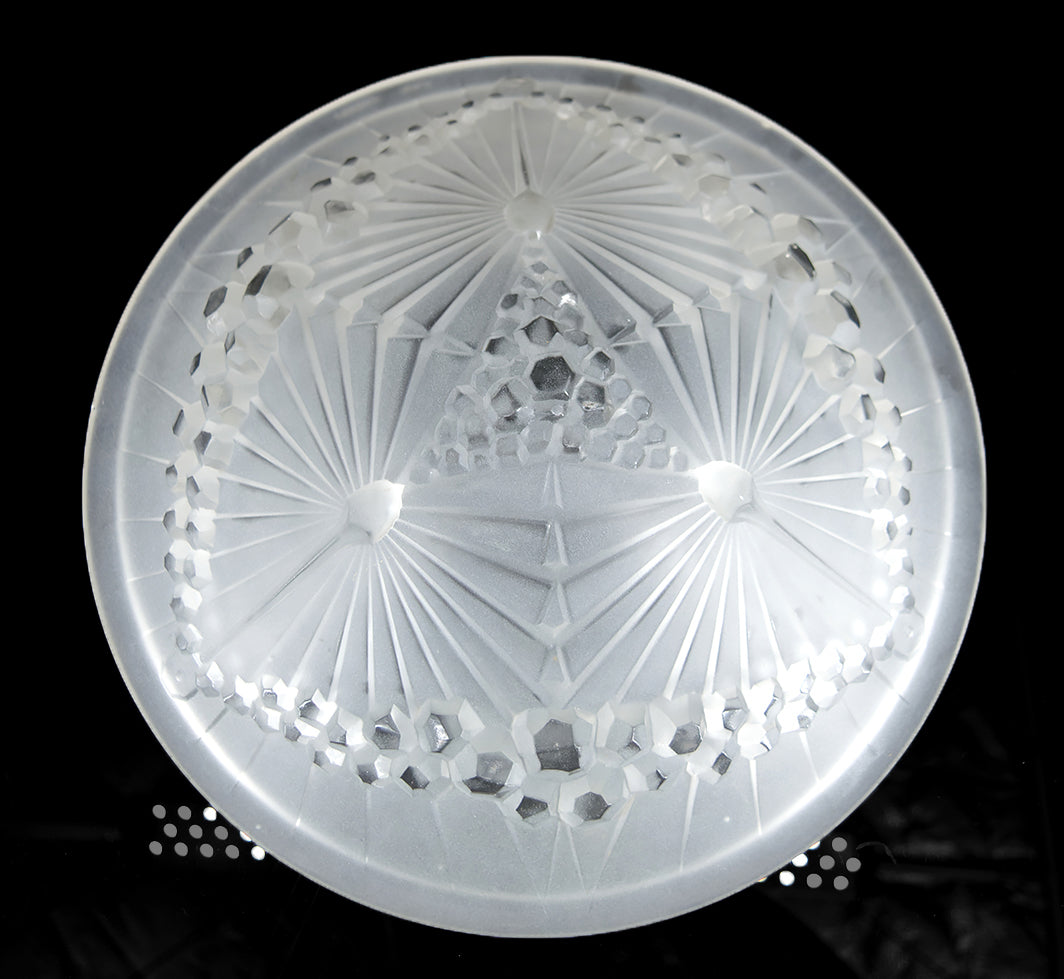 Le globe circulaire, d’un beau diamètre , présente un décor géométrique et stylisé, où les reliefs finement travaillés rappellent le dynamisme et la modernité du mouvement Art Déco.