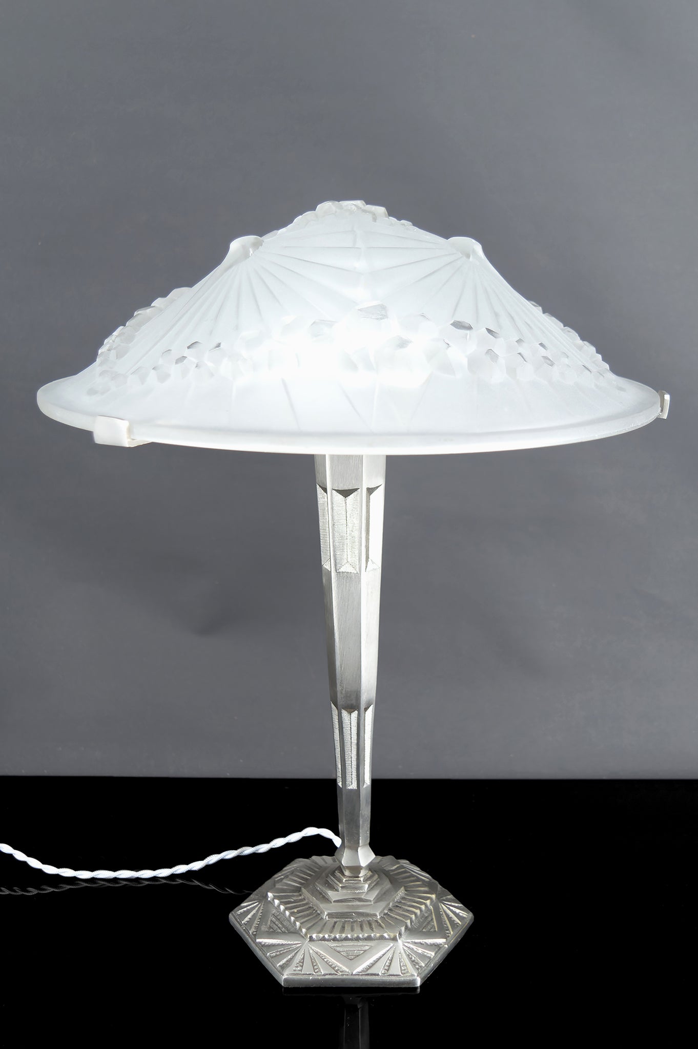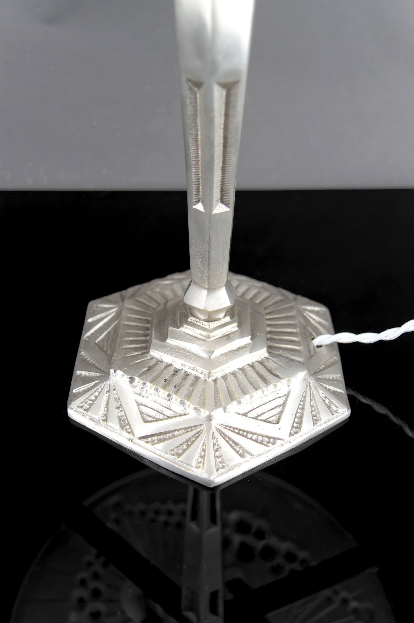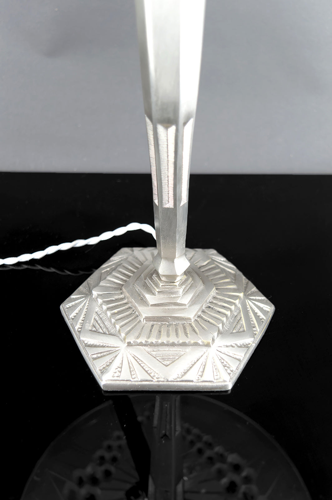 Réalisée en bronze massif nickelé, cette lampe affiche une silhouette puissante et parfaitement équilibrée, typique du vocabulaire Art Déco des années 1930.