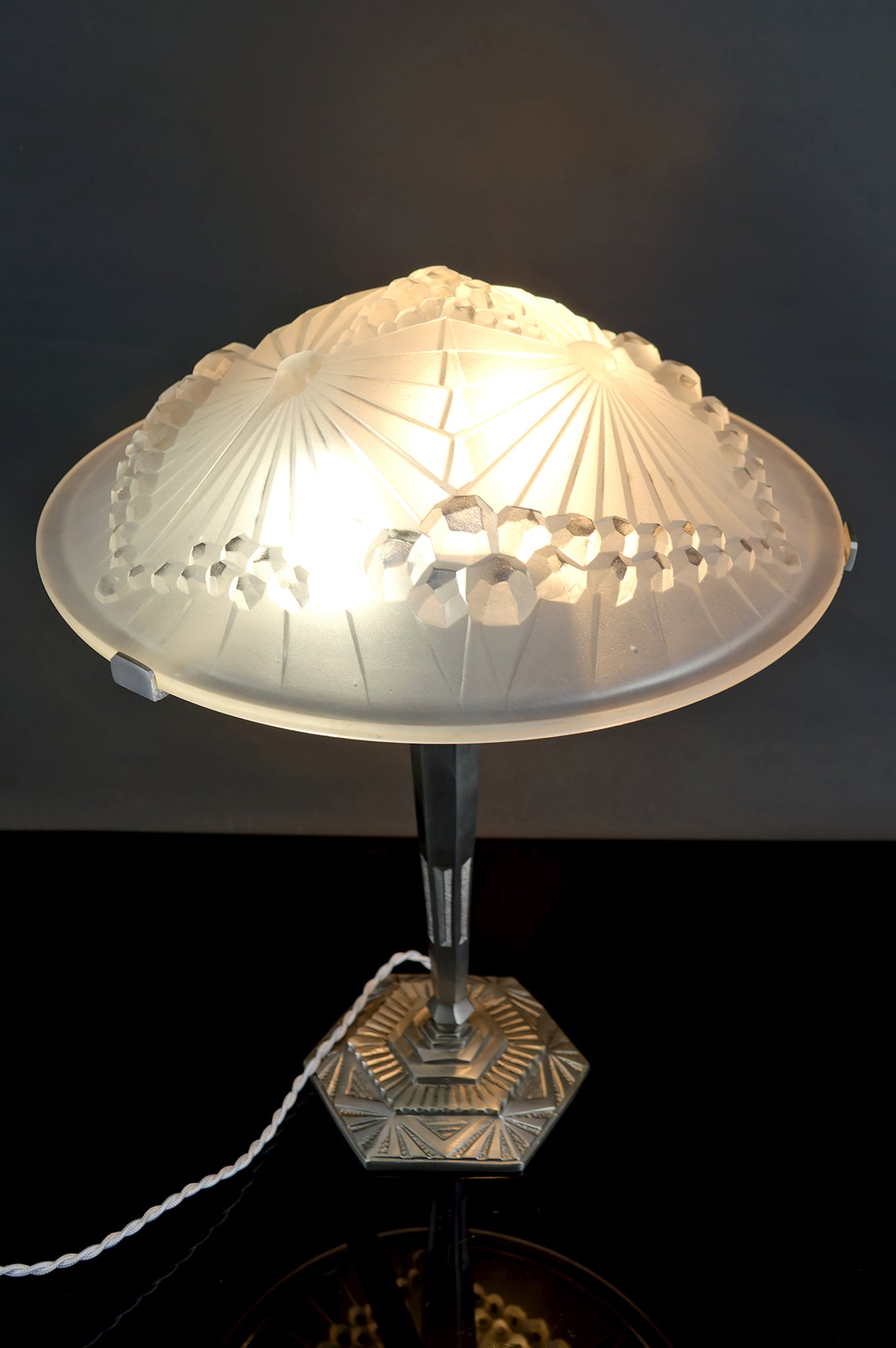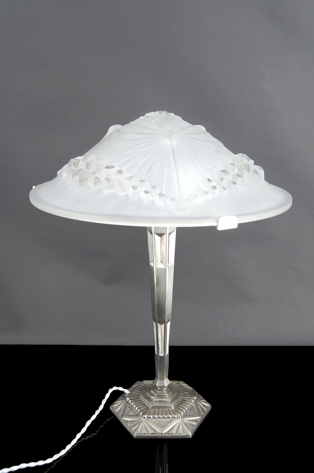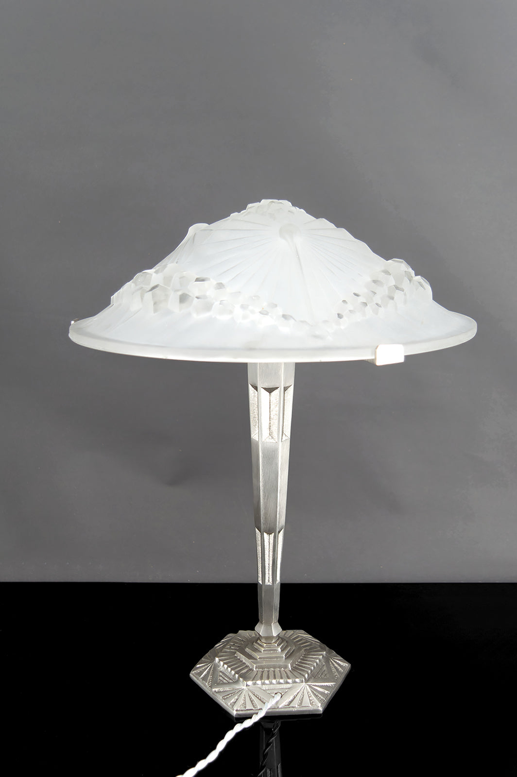 Chef-d’œuvre iconique de l’Art Déco français, cette importante lampe de table réunit tout ce que recherchent aujourd’hui les collectionneurs internationaux, décorateurs haut de gamme et amateurs de design historique : présence sculpturale, matériaux nobles, verrerie de créateur et rareté absolue.