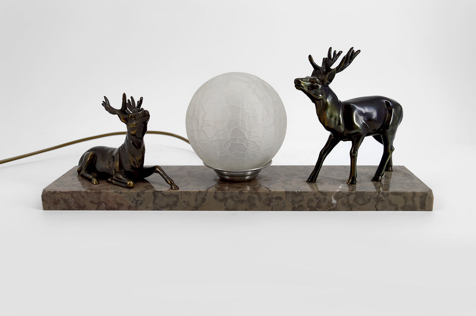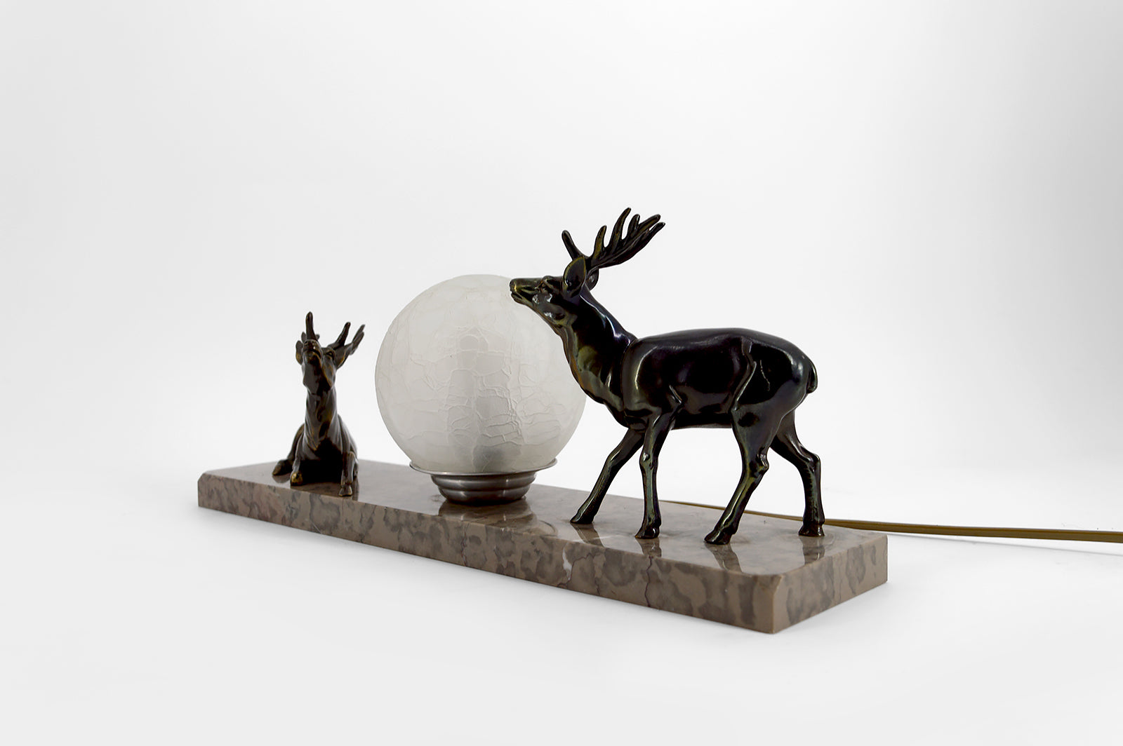 Cette pièce se distingue par une composition sculpturale équilibrée et narrative, mettant en scène deux cerfs finement modelés : l’un couché dans une posture paisible, l’autre debout, élancé et vigilant. Cette dualité crée un jeu visuel fort et une véritable scène décorative, typique du courant Art Déco figuratif animalier, prisé pour son élégance et son raffinement.