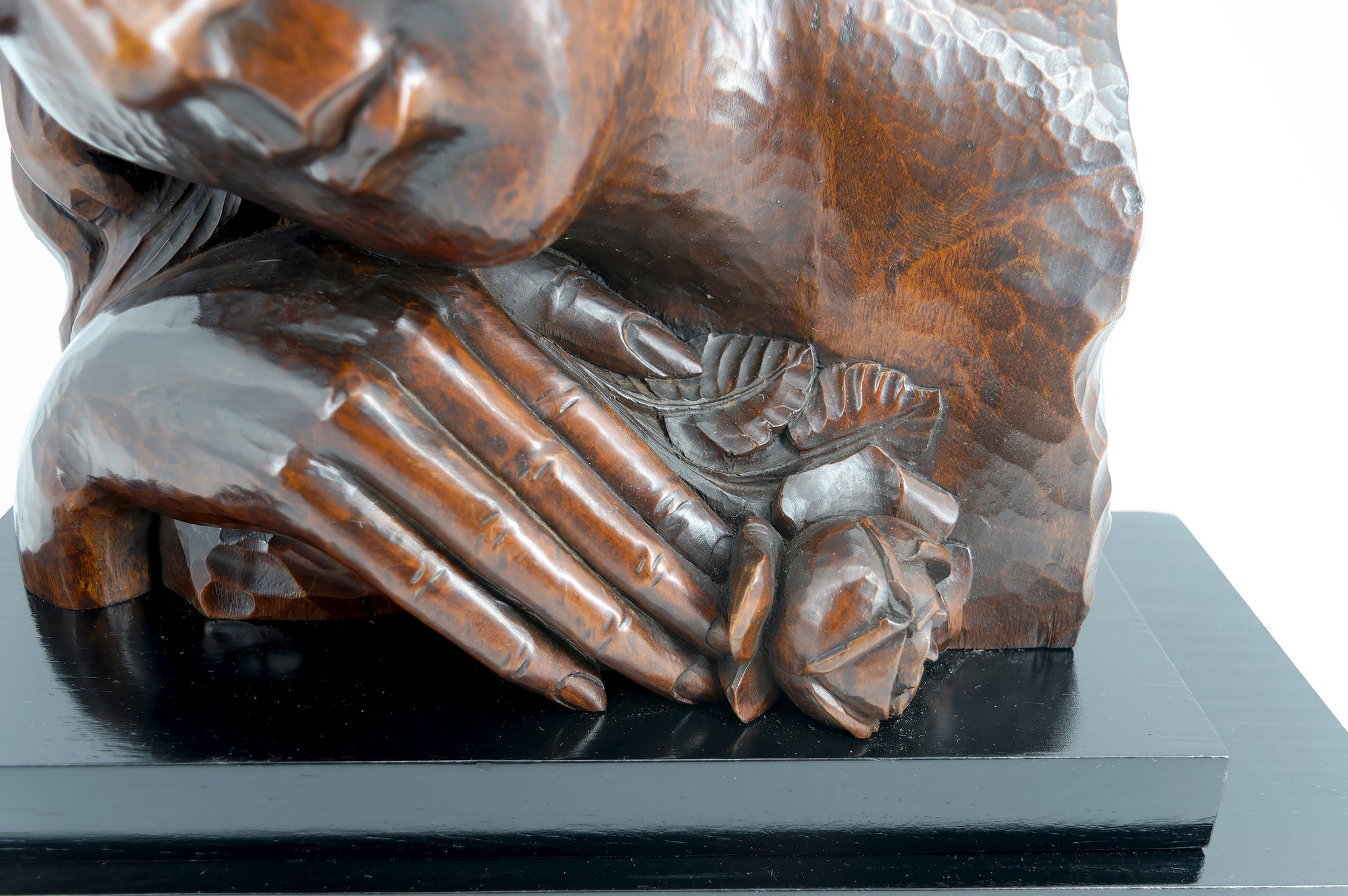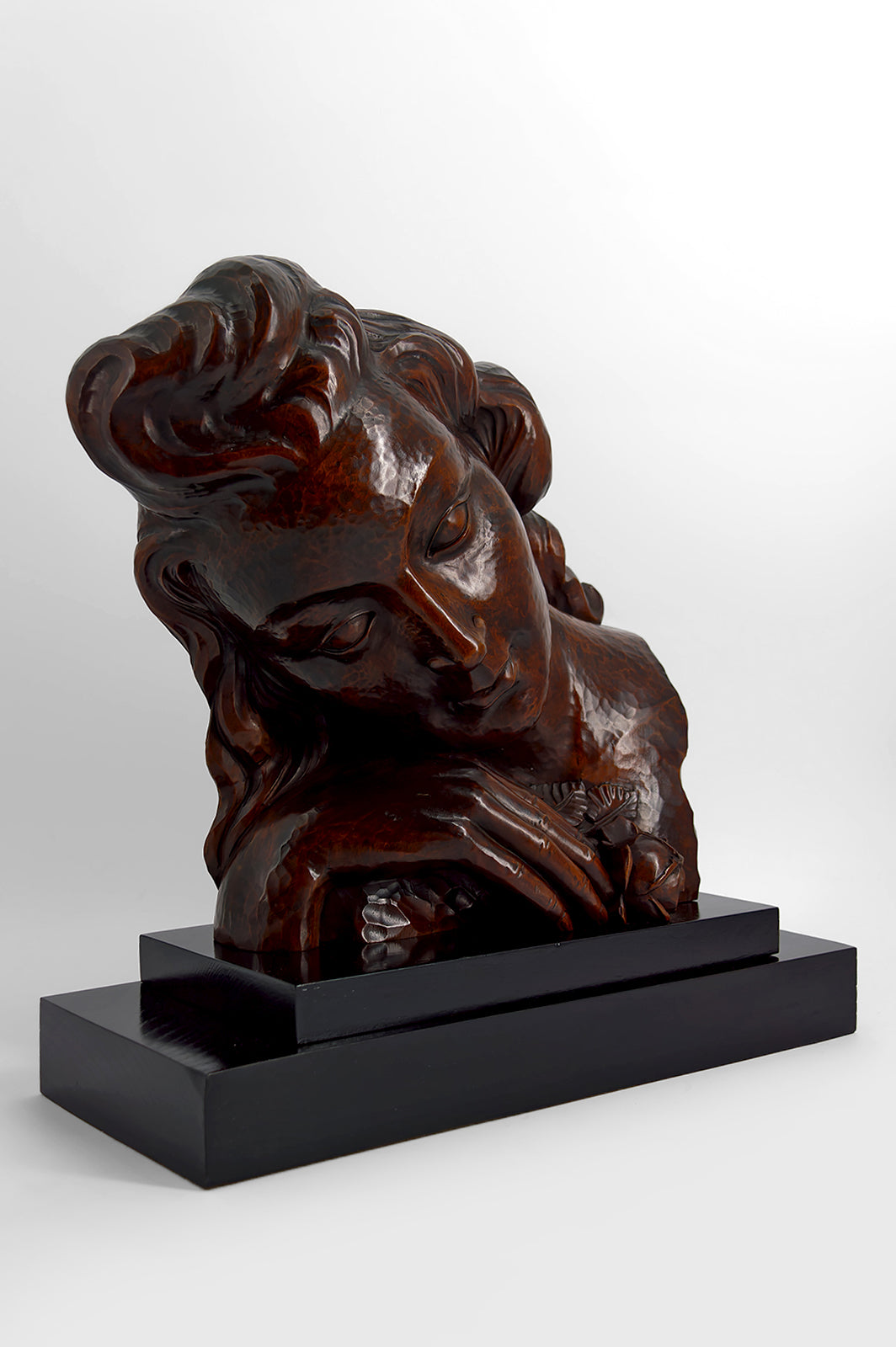 Réalisée dans un bois sombre à la patine profonde et chaleureuse, la sculpture révèle de belles nuances naturelles et une grande qualité d’exécution. Elle est présentée sur un socle noir sobre, soulignant son élégance et lui conférant une présence sculpturale affirmée.