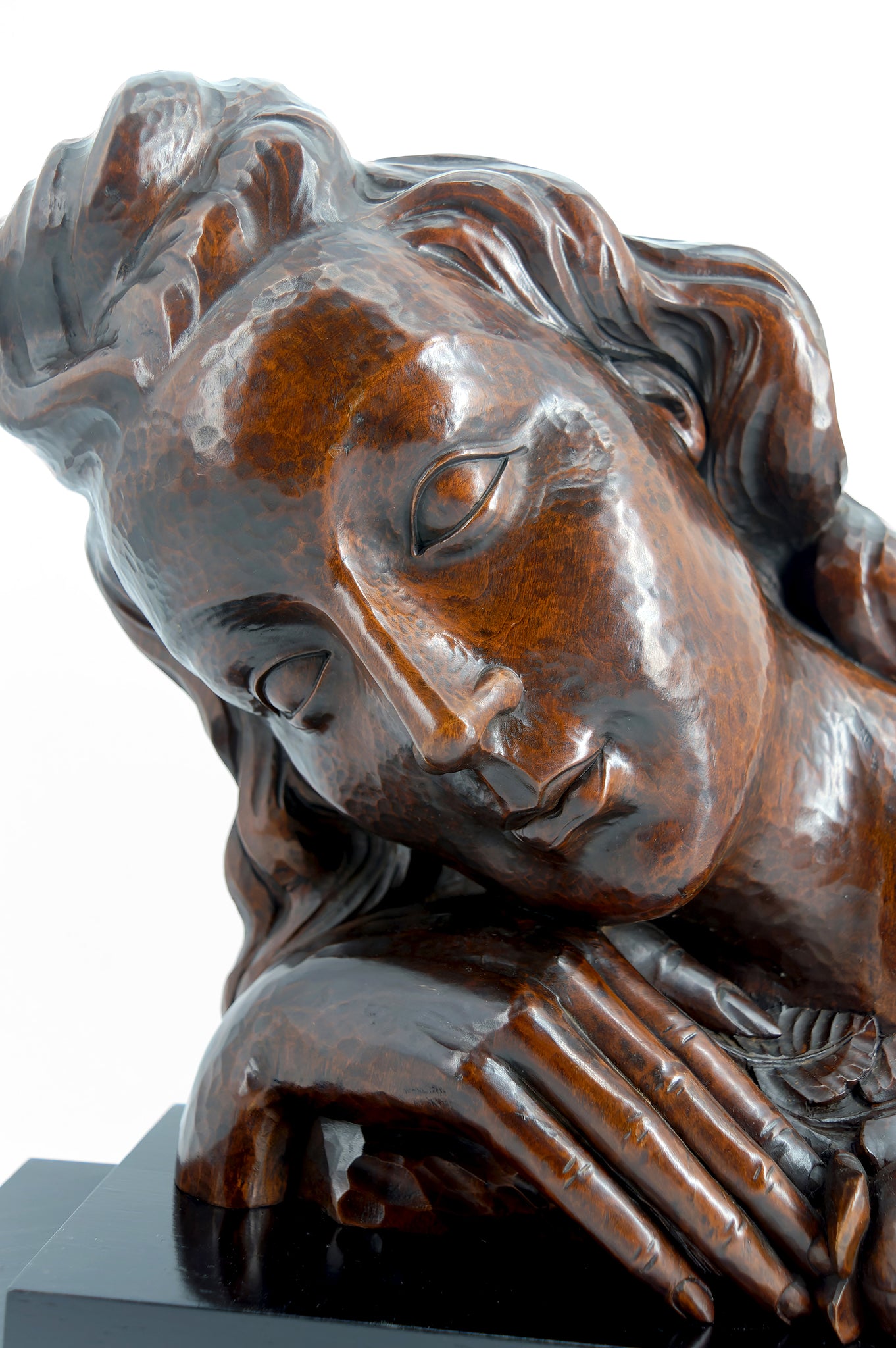 Rare et séduisante sculpture représentant un buste féminin incliné, la tête délicatement penchée dans une attitude empreinte de douceur et d’introspection. La figure repose sur un bras replié, tandis que la main retient une rose finement sculptée, symbole intemporel de beauté et de fragilité.
