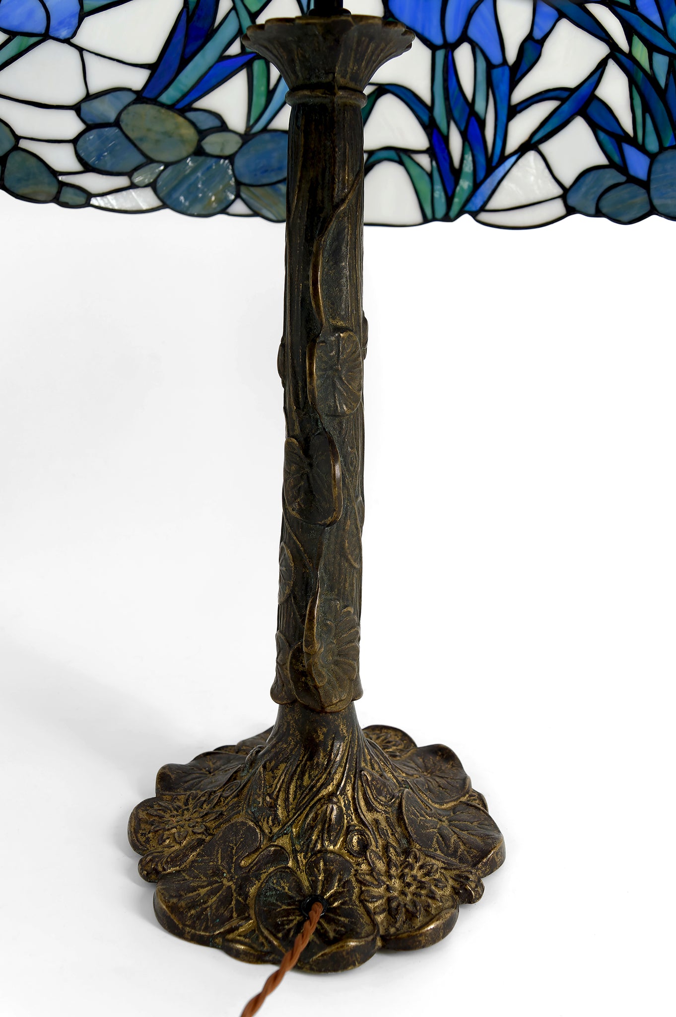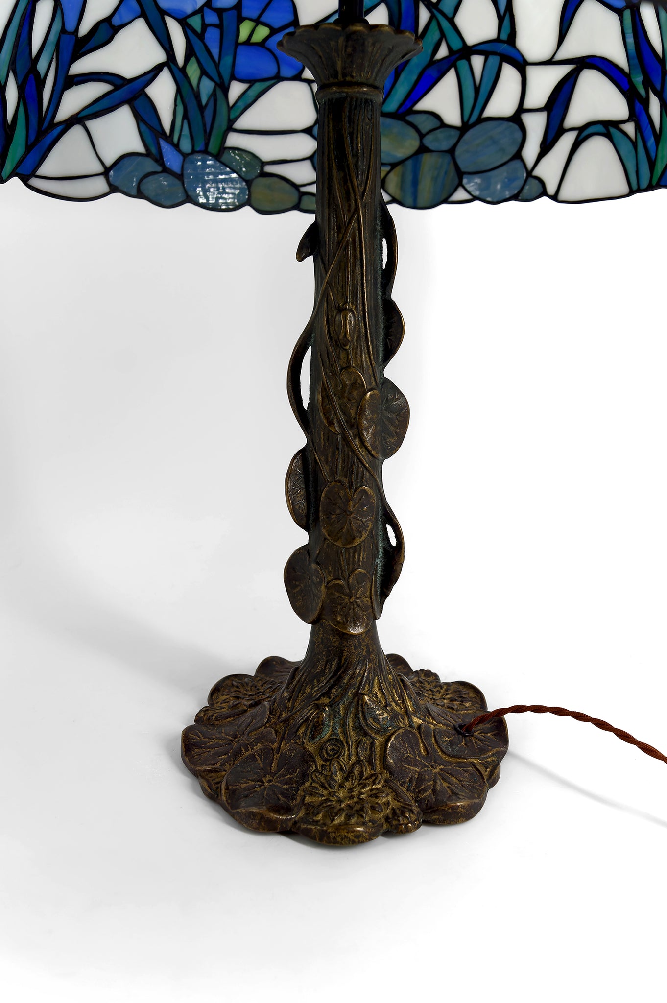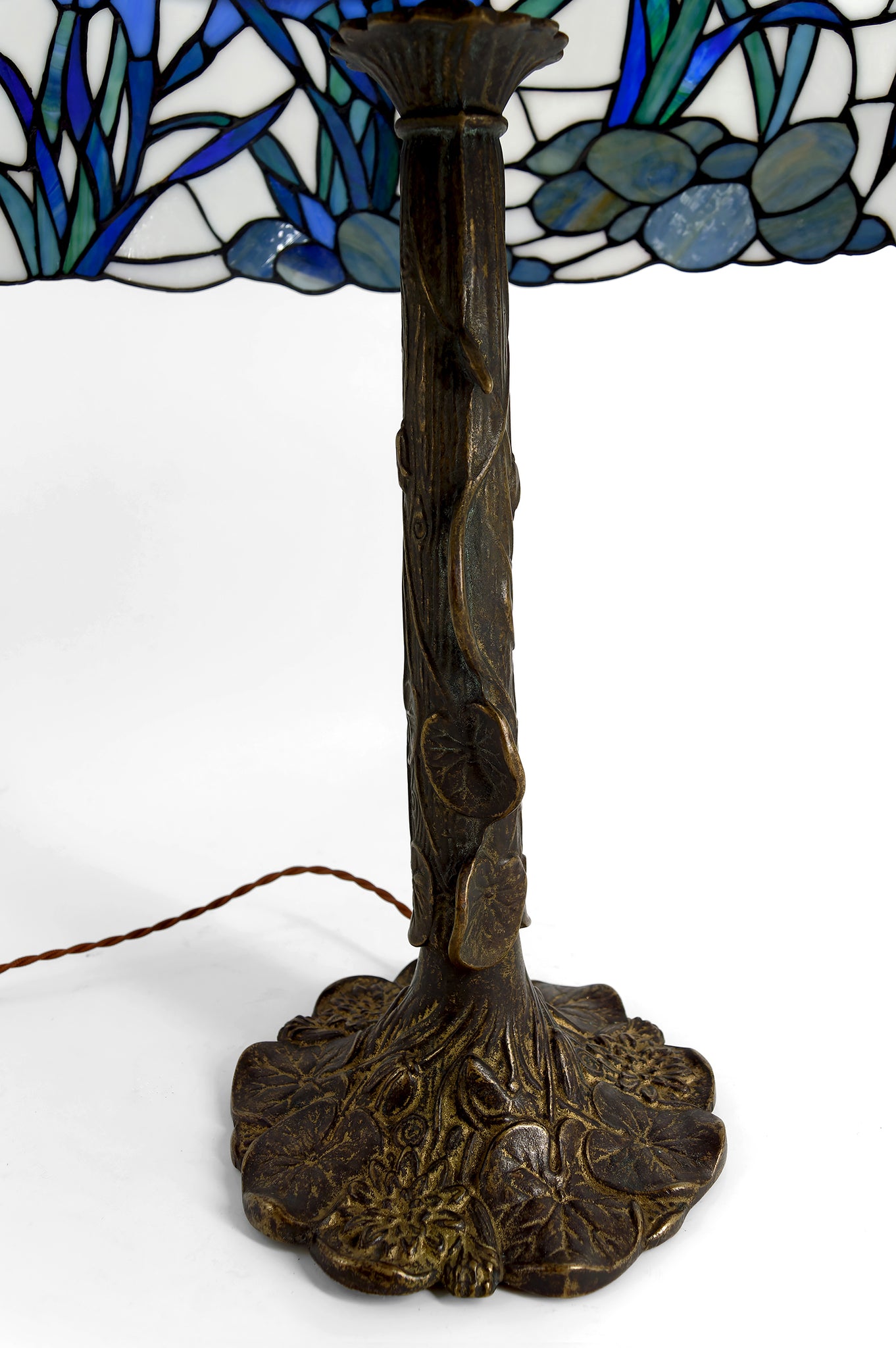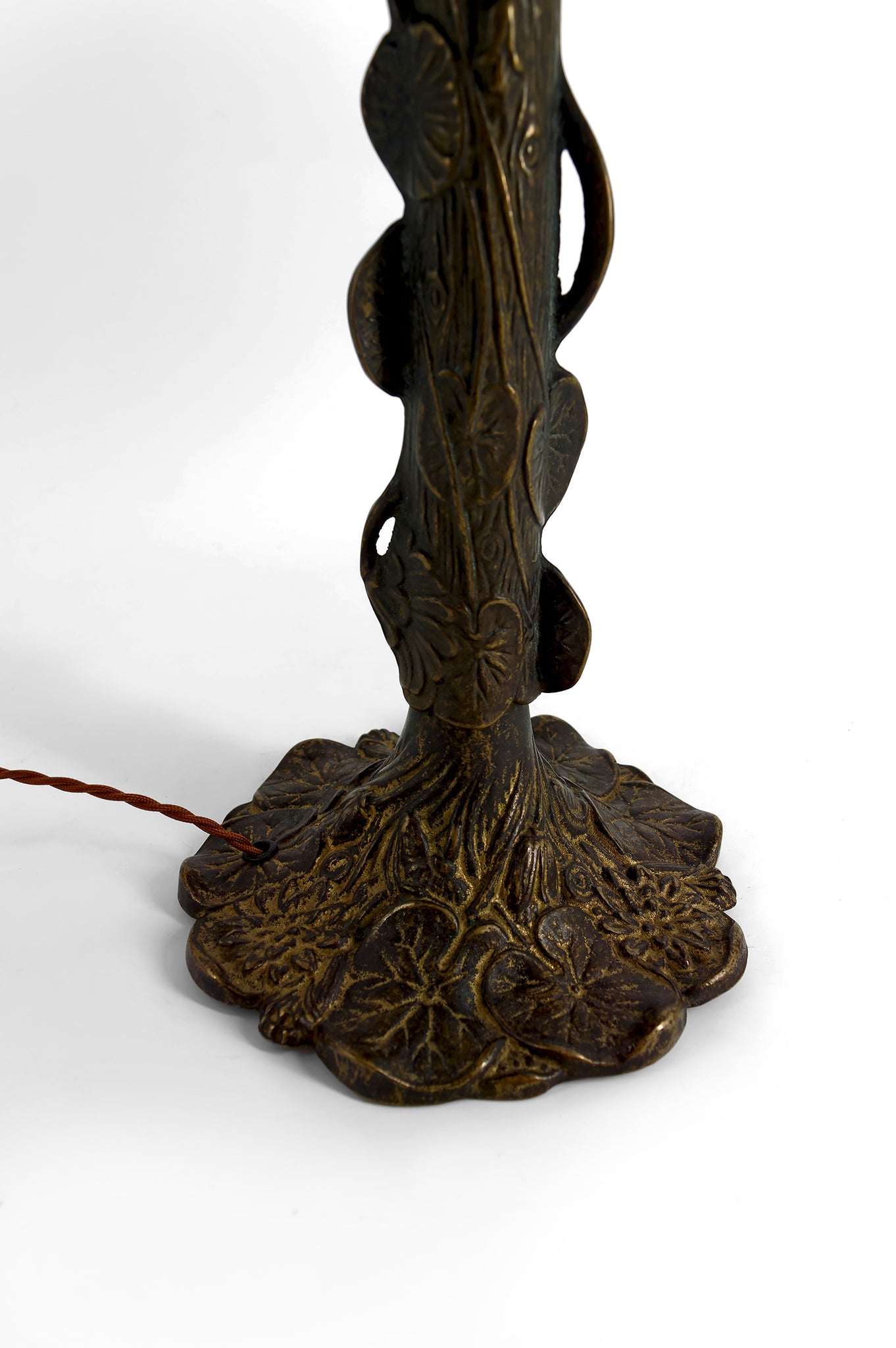 Le pied, en bronze patiné, est travaillé dans un esprit organique typiquement Art Nouveau. Il évoque des tiges aquatiques ondulantes, ponctuées de feuilles de nénuphars, s’épanouissant sur une base sculptée richement ornée.