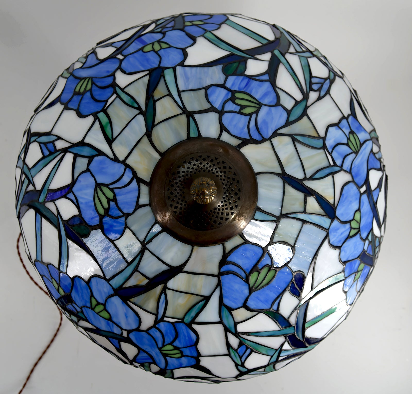 Le large abat-jour bombé, entièrement réalisé en vitrail serti de plomb, dévoile un somptueux décor naturaliste lacustre : élégantes jacinthes d’eau, feuillages aquatiques stylisés et rythmes végétaux fluides.