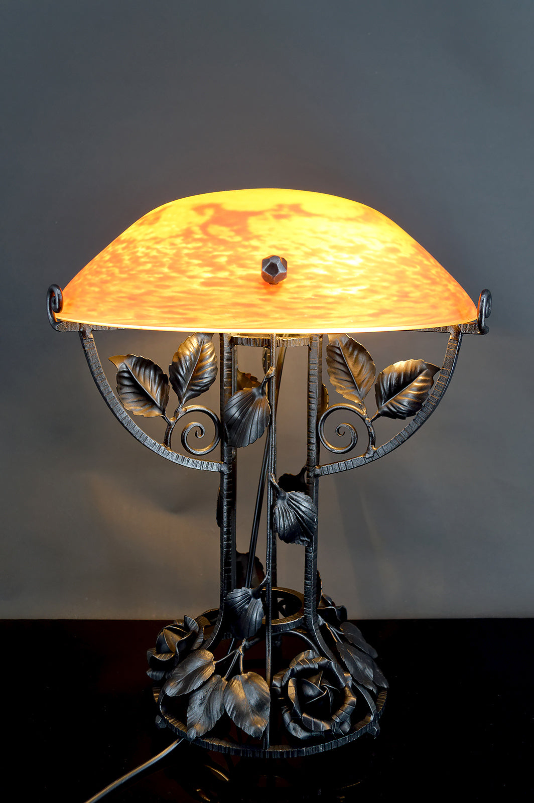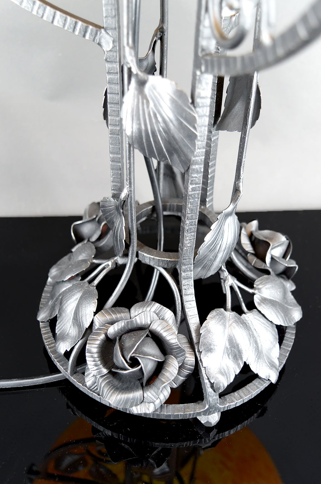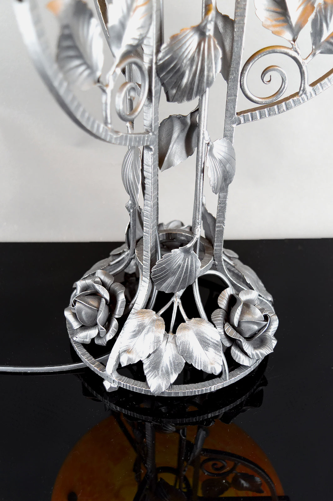 Cette lampe se distingue immédiatement par sa spectaculaire monture en fer forgé, d’une qualité d’exécution remarquable. La structure, entièrement travaillée à la main, déploie un décor floral somptueux composé de roses stylisées, feuilles nervurées et volutes élégantes, dans un équilibre parfait entre sensualité végétale et rigueur architecturale. Chaque détail révèle un travail artisanal de très haut niveau, typique des grandes productions de ferronnerie d’art françaises de la période Art Déco de transition, à la frontière de l’Art Nouveau finissant.