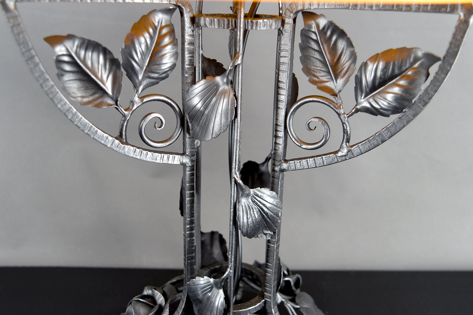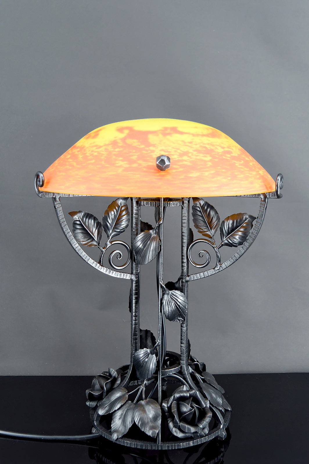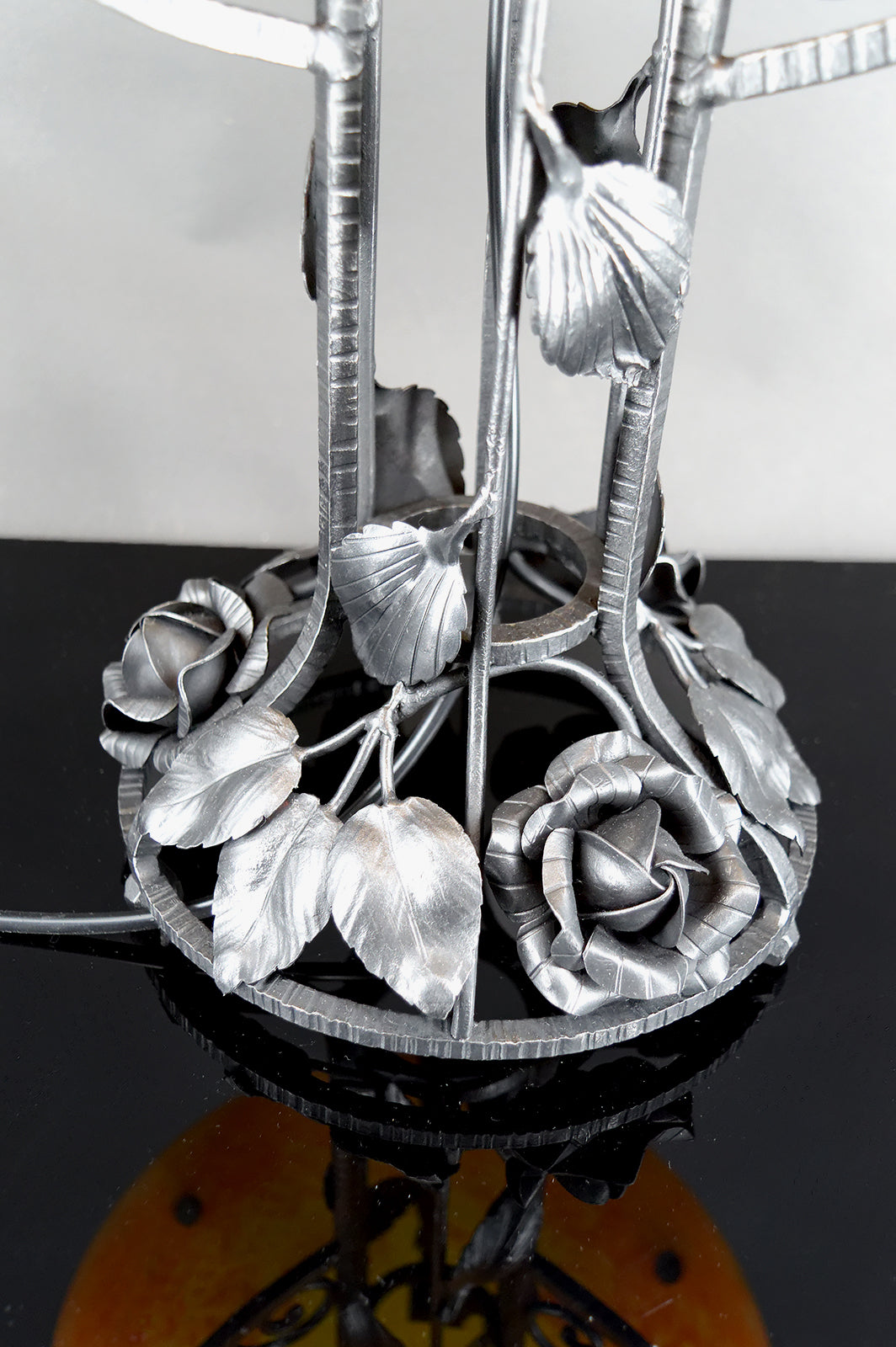 Cette lampe se distingue immédiatement par sa spectaculaire monture en fer forgé, d’une qualité d’exécution remarquable. La structure, entièrement travaillée à la main, déploie un décor floral somptueux composé de roses stylisées, feuilles nervurées et volutes élégantes, dans un équilibre parfait entre sensualité végétale et rigueur architecturale. Chaque détail révèle un travail artisanal de très haut niveau, typique des grandes productions de ferronnerie d’art françaises de la période Art Déco de transition, à la frontière de l’Art Nouveau finissant.