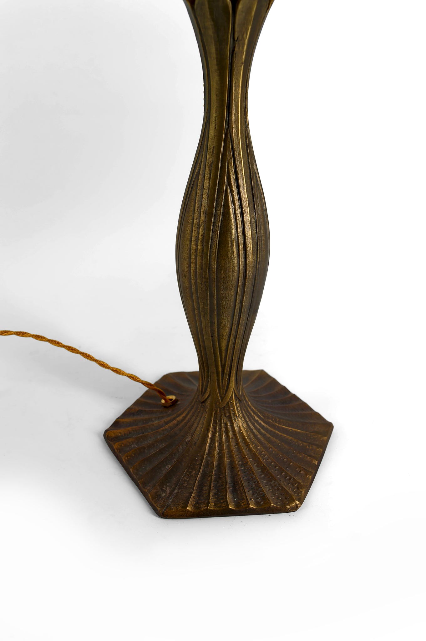 Le pied en bronze patiné, richement mouluré, se distingue par ses lignes élancées et sculpturales. Il repose sur une base hexagonale rayonnante, parfaitement équilibrée, conférant à l’ensemble une stabilité irréprochable et une présence visuelle forte. Chaque détail évoque le savoir-faire décoratif haut de gamme des productions inspirées Tiffany de la fin du XXᵉ siècle.