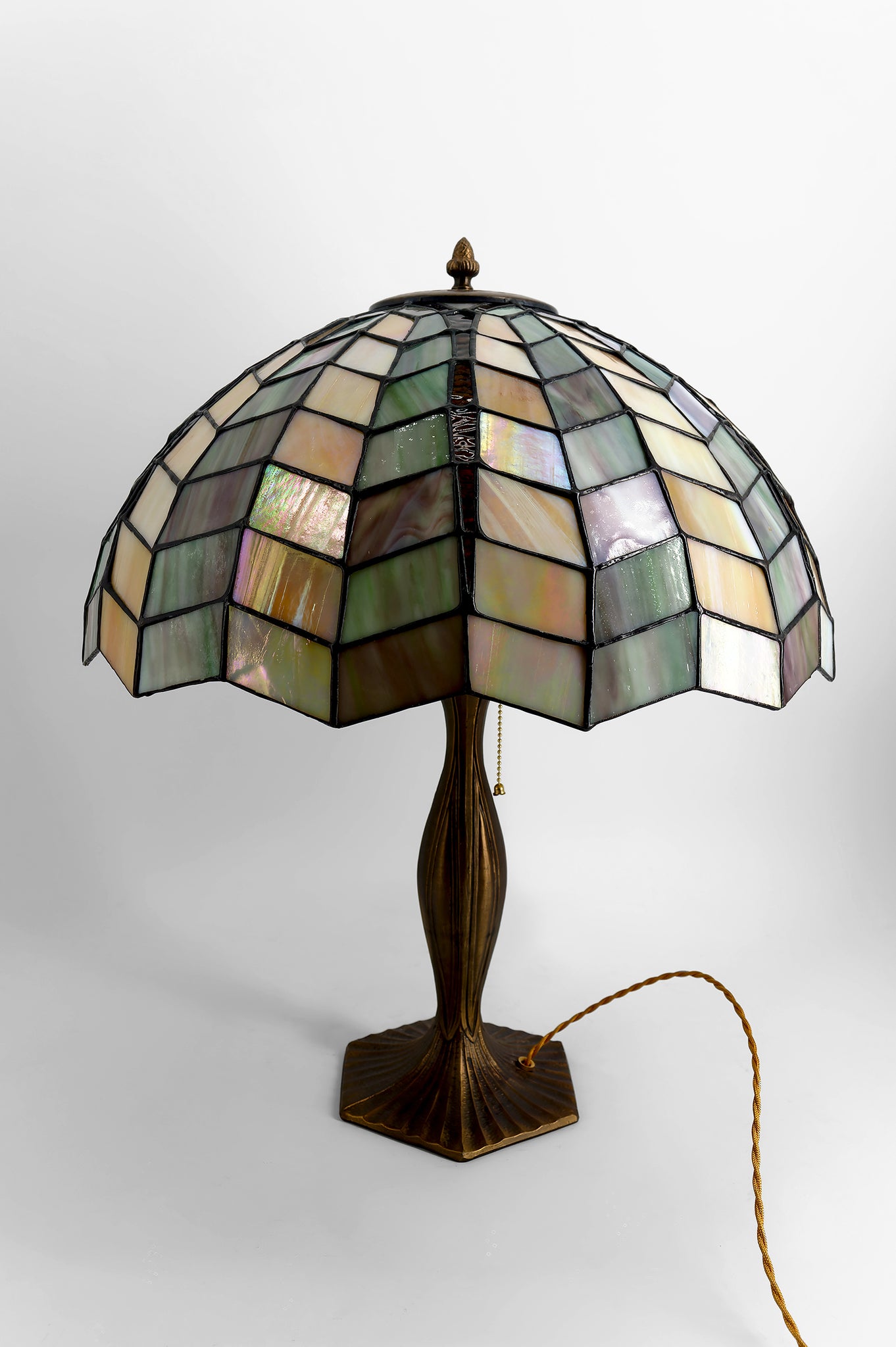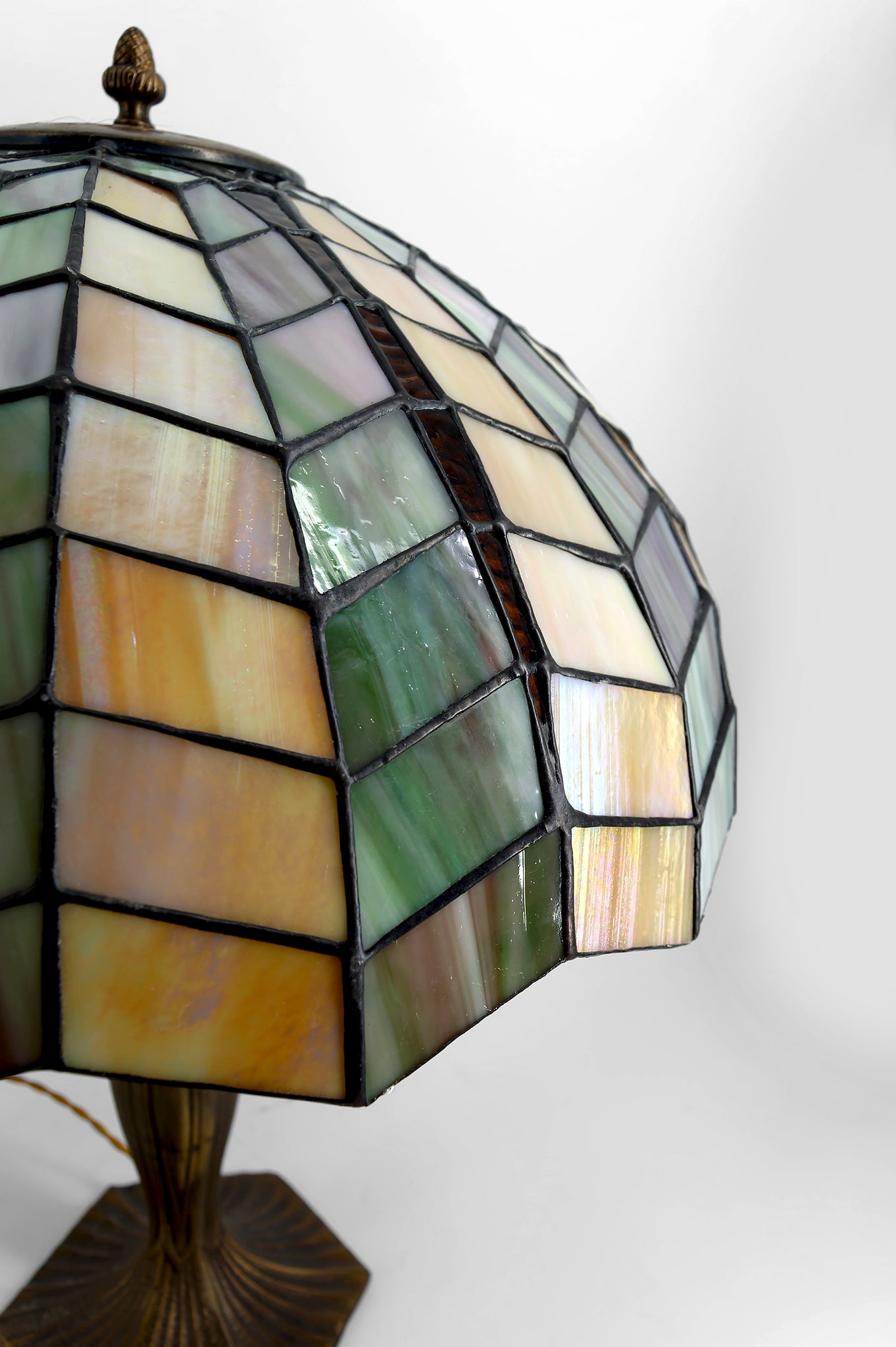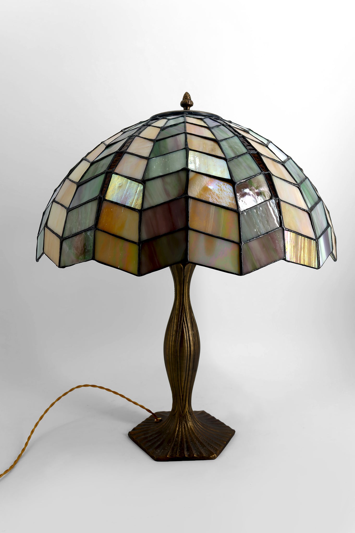 Lampe de table Art nouveau / Tiffany en bronze et vitrail – Pièce décorative d’exception – Circa 1980