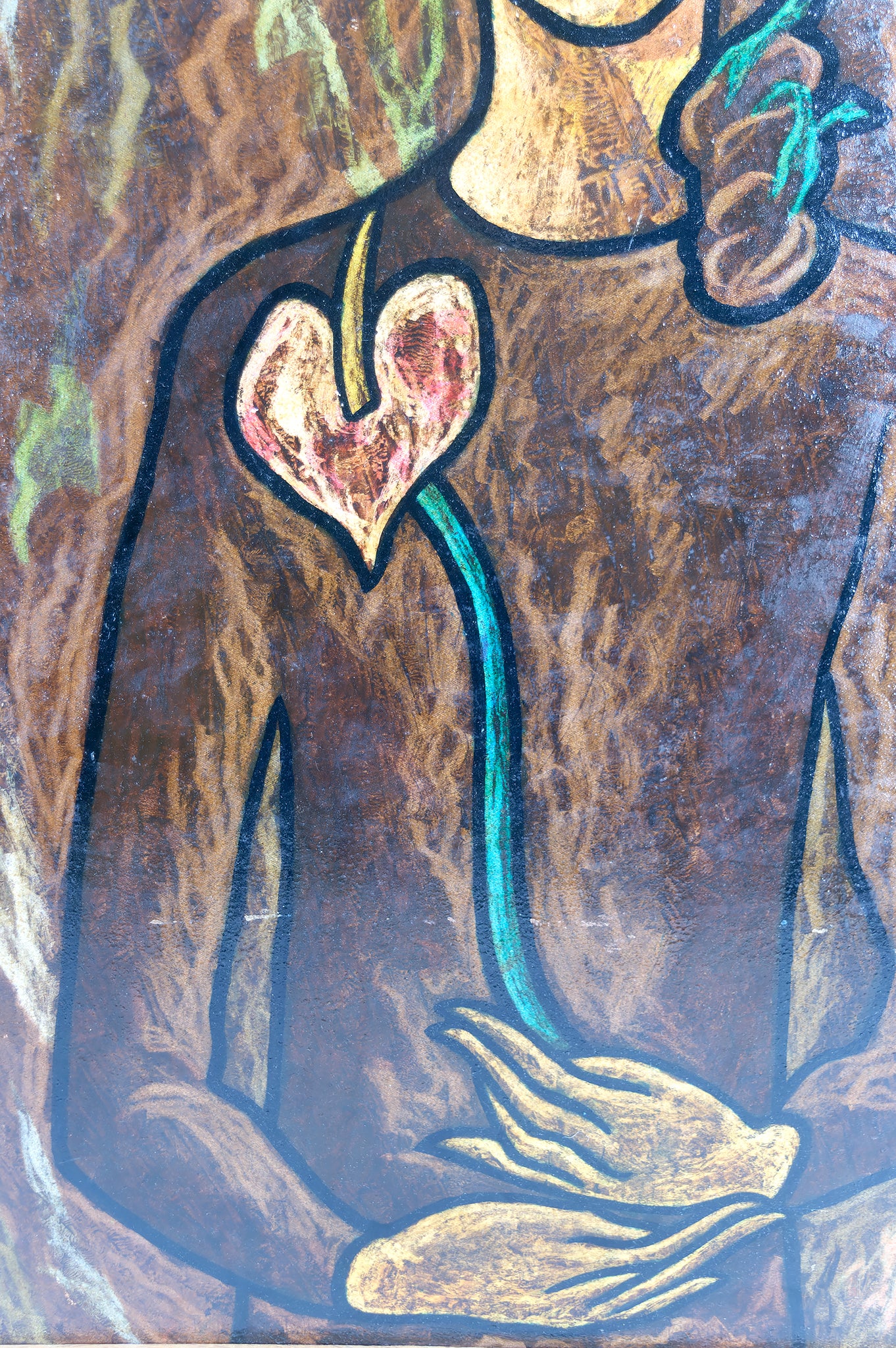 Au cœur de la composition, une fleur stylisée en forme de cœur constitue l’élément symbolique central. Reliée par une tige verte aux mains croisées de la jeune fille, elle suggère un lien intime entre le monde intérieur, la sensibilité et le geste. Ce motif, à la fois fragile et vital, traverse la toile comme une métaphore discrète de la vie, de l’émotion contenue et de la transmission.